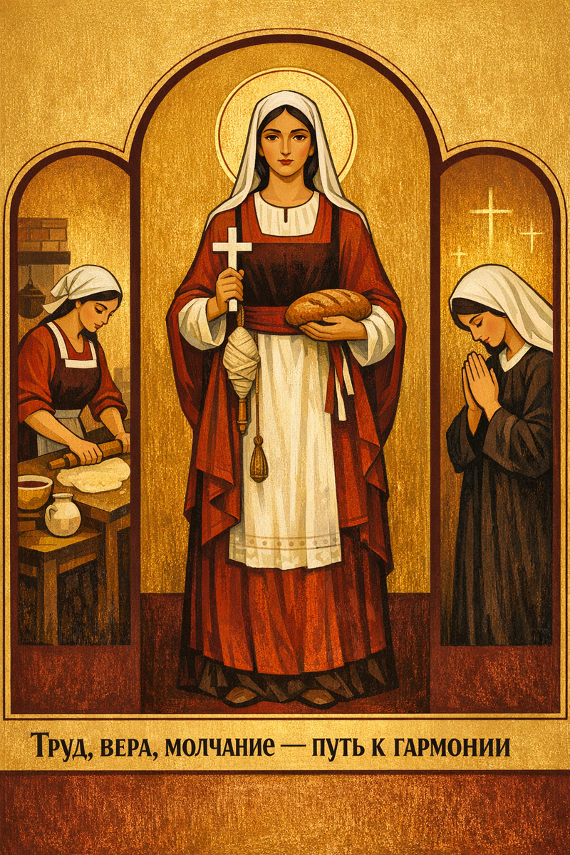 Жили в одном краю муж да жена — Андрей и Варвара. Дом их стоял не на виду, но всякий, кто в него входил, чувствовал: здесь всё держится не на показе, а на укладе. И говорили про Варвару: «Не шумна она, не видна, а дом её — как ладная песня: всё в нём на месте». И было в её жизни три дела, что нераздельно держали её день. Первое — труд. С раннего утра, пока ещё свет не окреп, зажигала она огонь, ставила воду, бралась за дело. И не было в том суеты: каждое движение — к месту, каждое дело — ко времени. Кухня у неё была не просто местом варки, а началом порядка: оттуда шёл строй всему дому. И говорили: «Где руки её — там не распадается». Второе — вера. Когда дело утихало, становилась она в тишине, склоняла голову и обращалась к невидимому. Не для вида, не для слова, а для основания. И будто над ней и над домом поднималось нечто невесомое, но крепкое — то, что удерживает, когда человеческое слабеет. И говорили: «Есть у неё опора — потому и не колеблется». Третье — молчание. Не в том, чтобы