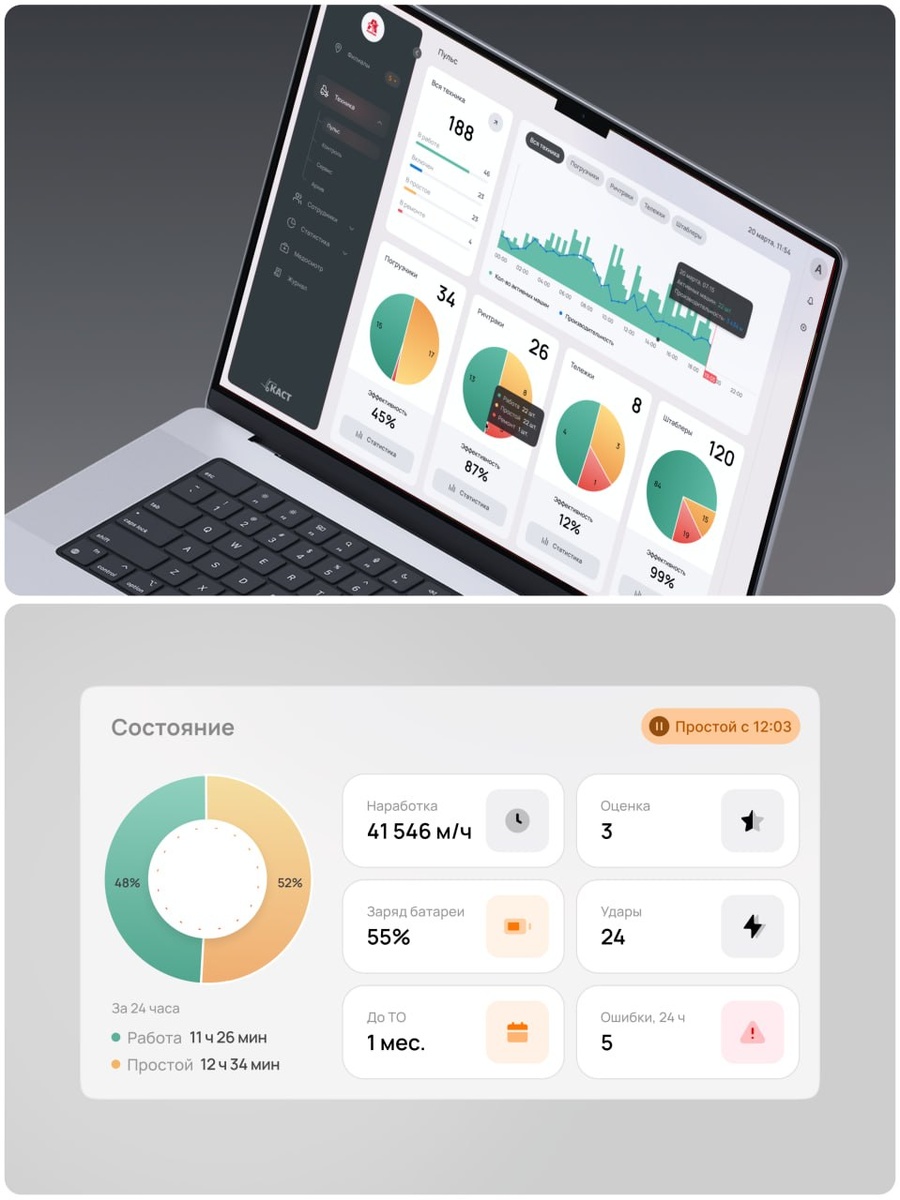». Опубликовано на Dprofile (отметить лайком – приветствуется 🙂) Здесь показаны экран «Пульс» и часть интерфейса с данными по технике. «Пульс» обсуждался как экран для руководителя, поэтому в работе отдельно разбирали состав показателей и подачу экрана: отказались от лишних изображений техники, чтобы он выглядел сдержаннее, и вывели показатели, по которым можно быстро оценить текущее состояние парка. Окно с данными раскрывает уже рабочие показатели по конкретной технике: наработку, сколько часов осталось до ТО, блокировки, дни в ремонте, удары и сервисные данные. #фрагмент #проект #каст Дизайнер на всю голову
