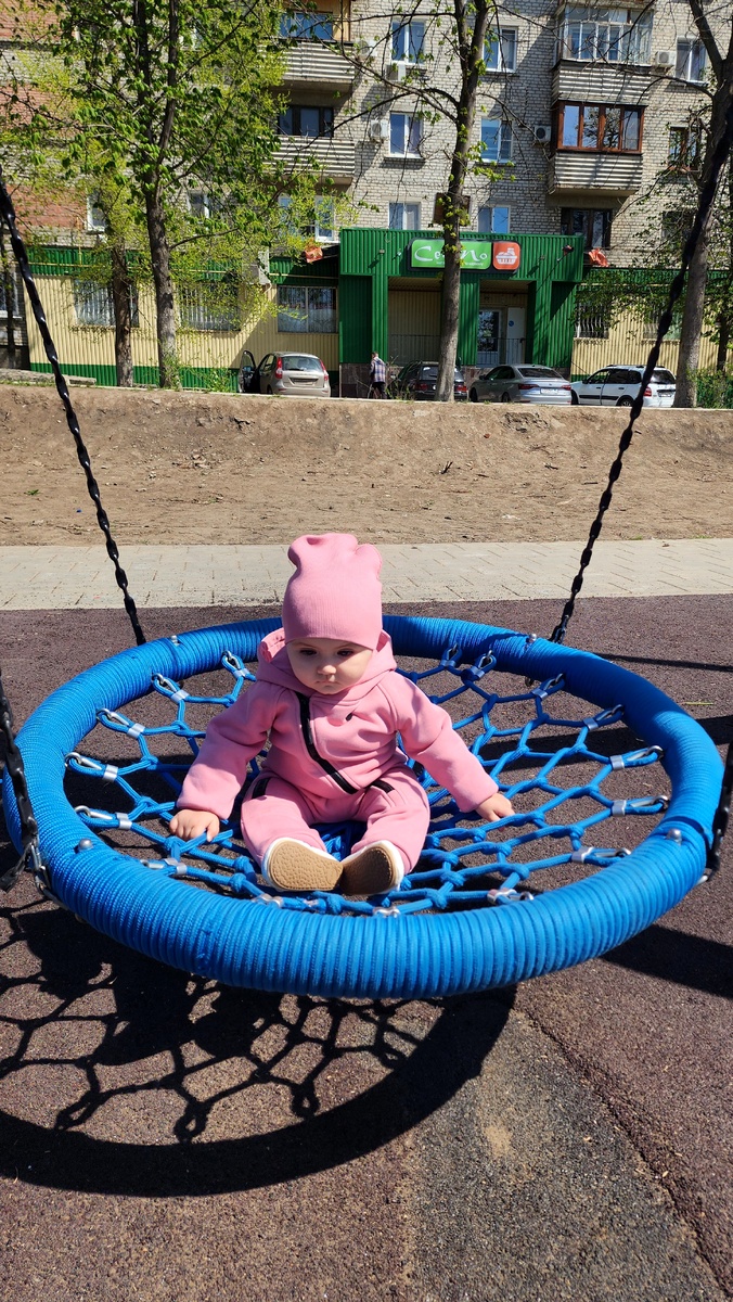 Маялась я, маялась, собрала Мирославу и спустилась с ней на руках. Покатались на качели, покрутили колечки и кубики на игровом комплексе, а горку Мира испугалась, поэтому сели на лавку, наблюдая за детьми постарше.