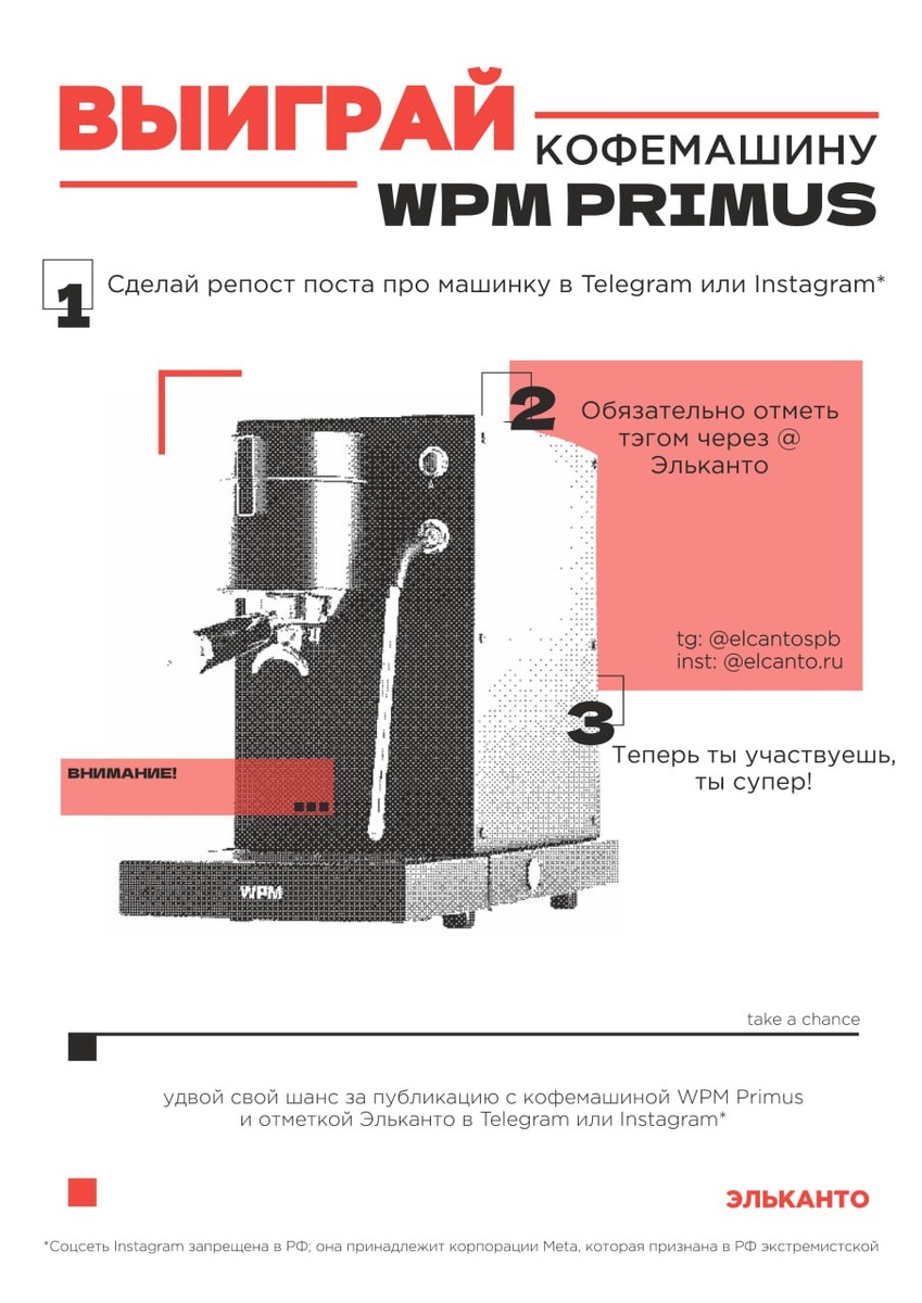 ! 🚀 Все дни выставки на нашем стенде #С12 обжарщики со всей страны будут готовить свой кофе на кофемашине WPM Primus. Это полупрофессиональная модель, которая сочетает в себе довольно профессиональный набор функций. В последний день выставки мы разыграем эту кофемашину среди гостей стенда. Для участия необходимо подписаться на канал, сделать репост этой публикации в сториз и отметить нас. Дальше – дело за удачей и везением! А чтобы повысить свои шансы, публикуйте и другие интересные истории со стенда Эльканто – публикация удвоит шанс на выигрыш ⚡️ Забрать кофемашину можно будет прямо со стенда в последний день выставки.