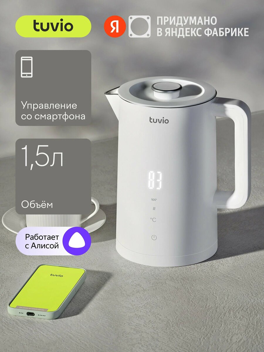 Представьте утро: вы только что проснулись, ещё не встали с кровати, а ваш чайник уже кипятит воду по команде Алисы. Звучит как сцена из футуристического фильма? С умным чайником Tuvio TKP0917S это ваша реальность! Давайте разберём, почему этот гаджет заслуживает места на вашей кухне. Первое, что бросается в глаза — стильный минималистичный дизайн. Белый матовый корпус из качественного пластика не только выглядит эстетично, но и практичен: не собирает отпечатки пальцев и легко чистится. Компактные размеры (21 × 18 × 25 см) и вес всего 1,04 кг позволяют разместить чайник даже на небольшой кухне. Особенность дизайна — двойные стенки корпуса. Они не только придают чайнику современный вид, но и выполняют практическую функцию: На передней панели расположен LED-дисплей, который отображает текущую температуру воды. А сенсорное управление делает взаимодействие с чайником интуитивно понятным. Tuvio TKP0917S — это не просто чайник, а полноценный участник экосистемы «Умного дома». Его ключевые во