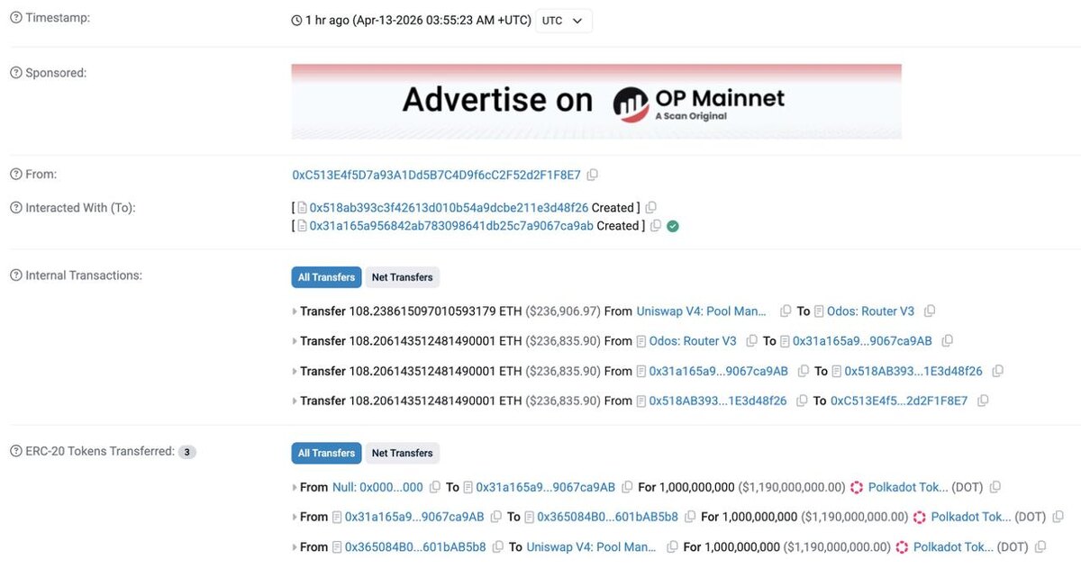 Хакер напечатал 1b DOT и продал весь объем одной транзакцией за 108,2 ETH ($237k).