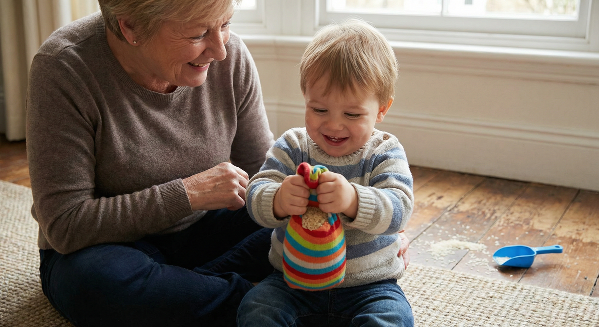 Важно для бабушки (или дедушки): если ребенок захочет развязать мешочек и высыпать крупу - разрешите! Это исследовательское поведение. Просто постелите клеенку или играйте на кухне. Собрать крупу совочком — еще одно полезное упражнение.