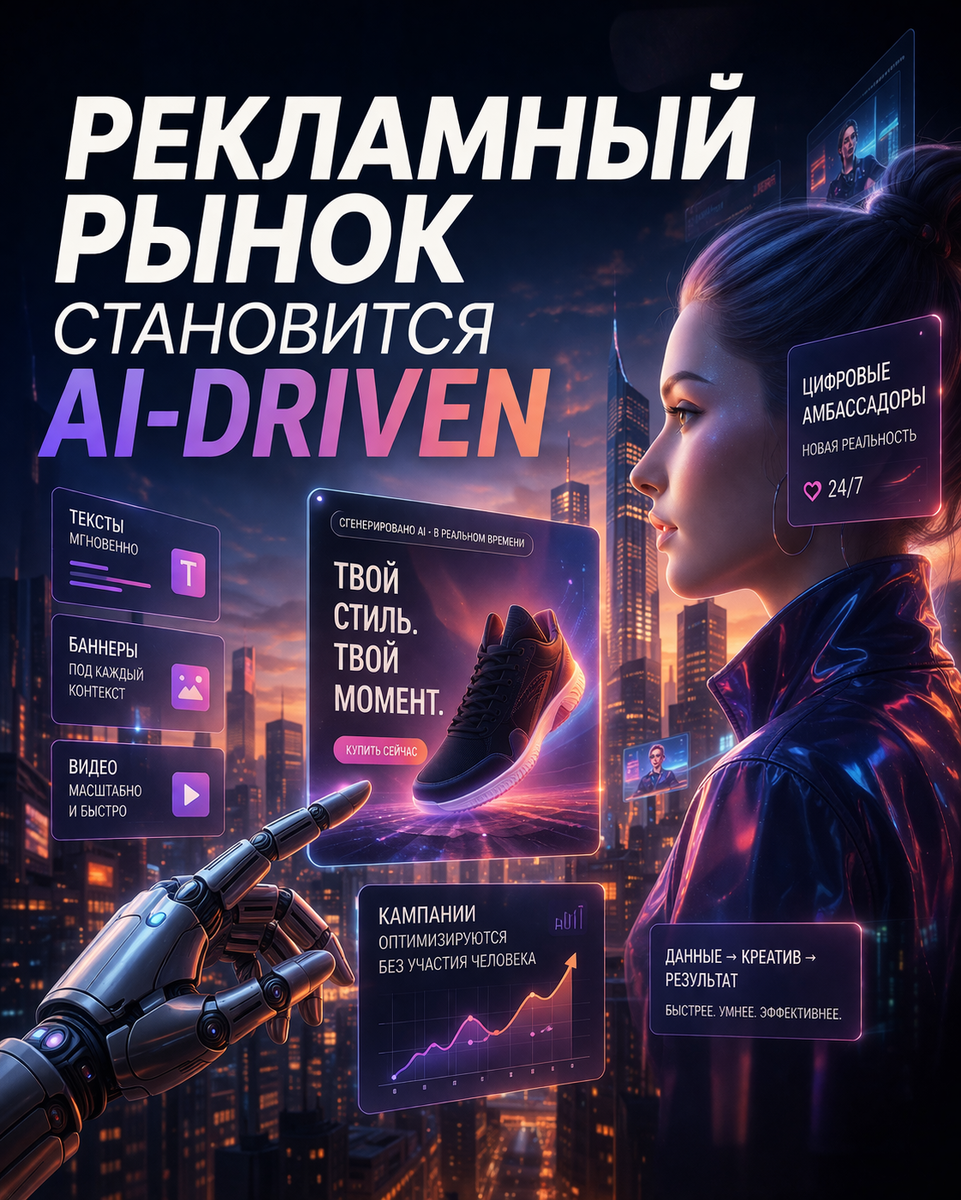 Весна 2026 — момент, когда рекламная индустрия окончательно переходит в AI-first режим. То, что еще недавно казалось экспериментом, стало базовой инфраструктурой маркетинга. 1. Генерация креатива в реальном времени