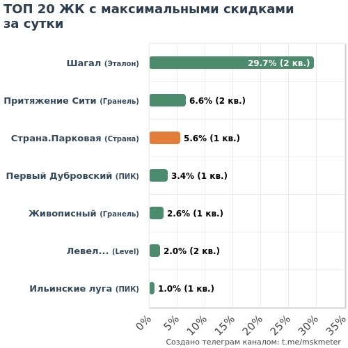 🟩 Честные скидки: 6 ЖК (9 кв.) 🟧 Маркетинг скидки: 3 ЖК (14 кв.) 💎 МАКСИМАЛЬНАЯ ЭКОНОМИЯ 🏆 Эталон • Шагал ├🔻14.7M → 49.4M • 3-к 90м² └🔻1.8M → 36.8M • 3-к 80м² 🥈 ПИК • Первый Дубровский └🔻734к → 21.8M • 1-к 42м² 🥉 Гранель • Притяжение Сити ├🔻713к → 10.8M • 2-к 51м² └🔻689к → 10.5M • 2-к 49м² 4️⃣ Level • Левел Мичуринский, этапы 3 и 4 ├🔻443к → 22.1M • 2-к 41м² └🔻315к → 15.7M • Студия 21м² 5️⃣ Гранель • Живописный └🔻166к → 6.3M • 1-к 33м² 6️⃣ ПИК • Ильинские луга └🔻94к → 9.0M • 1-к 33м² 👇 Полная статистика: 📲 В Telegram | 🌐 На MskMeter.ru