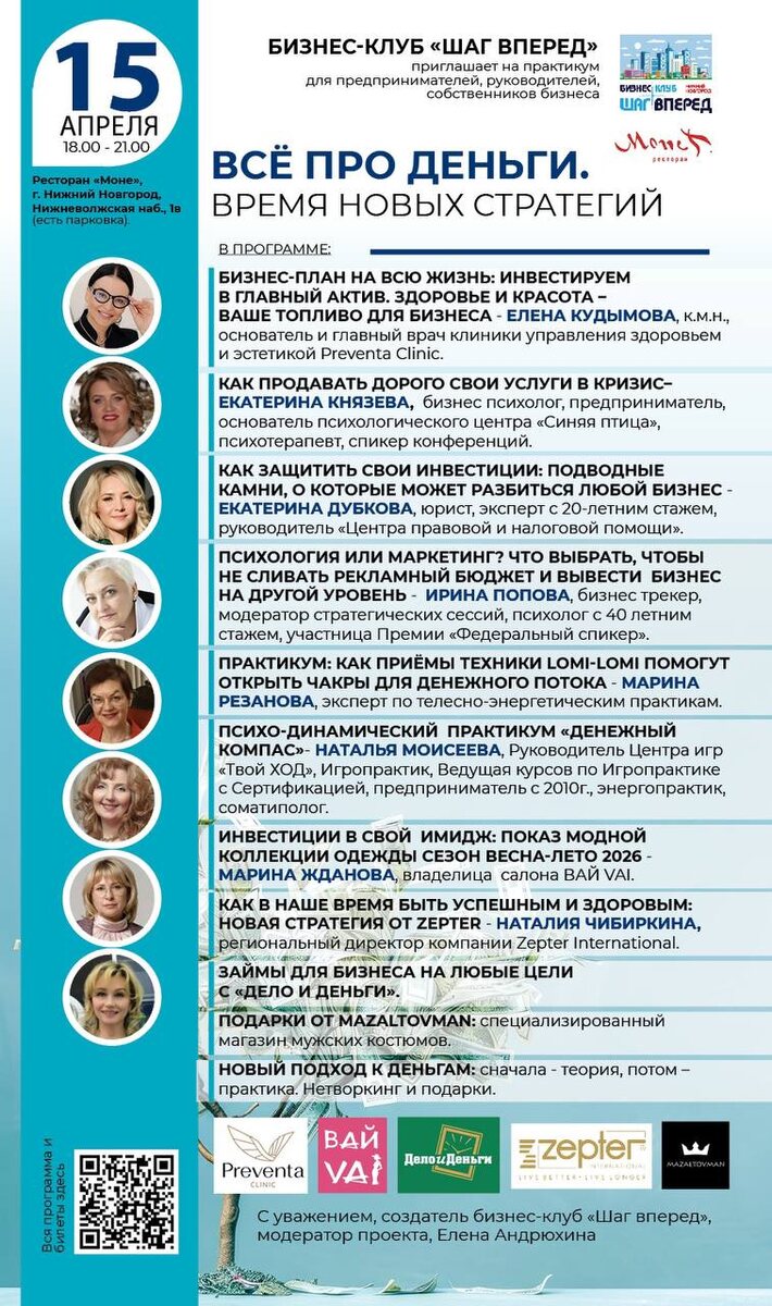 ВРЕМЯ НОВЫХ СТРАТЕГИЙ»👍💯🔥 📆15 апреля 2026г, среда, 18.00 - 21.00 📍Ресторан «Моне», г. Нижний Новгород, Нижневолжская наб., 1в ✅ Бизнес-план на всю жизнь: Инвестируем в главный актив. Здоровье и красота - ваше топливо для бизнеса - Елена Кудымова , к.м.н., основатель и главный врач клиники управления здоровьем и эстетикой Preventa Clinic. ✅ Как продавать дорого свои услуги в кризис– Катерина Князева , бизнес психолог, предприниматель, основатель психологического центра «Синяя птица», психотерапевт, спикер конференци. ✅Как защитить свои инвестиции: подводные камни, о которые может разбиться любой бизнес - Екатерина Дубкова , юрист, эксперт с 20-летним стажем, руководитель «Центра правовой и налоговой помощи». ✅Психология или маркетинг? Что выбрать, чтобы не сливать рекламный бюджет и вывести бизнес на другой уровень - Ирина Попова , бизнес трекер, модератор стратегических сессий, психолог с 40 летним стажем, участница Премии «Федеральный спикер». ✅ ПРАКТИКУМ: Как приёмы техник