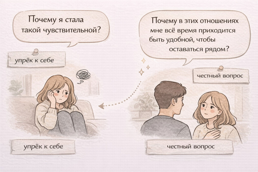 Зачастую проблему замечают только тогда, когда уже нет сил. Когда уже невозможно всё время быть спокойной, понимающей, терпеливой. И в этом месте появляется первый по-настоящему важный сдвиг: вопрос перестаёт звучать как упрёк к себе — «почему я стала такой чувствительной?» — и начинает звучать честнее: «почему в этих отношениях мне всё время приходится быть удобной, чтобы оставаться рядом?» Именно с этого и начинается возвращение к себе.
