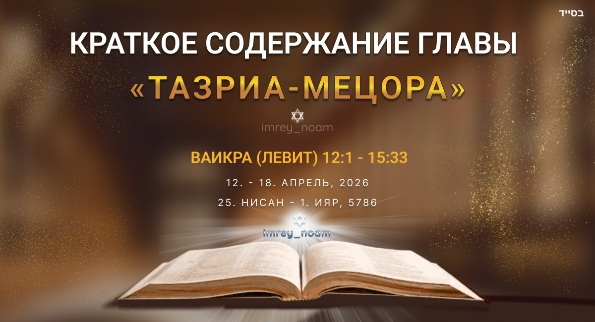 Краткое содержание главы "Тазрия-Мецора" Вайикра (Левиты) 12:1-15:33 Главы "Тазриа" и "Мецора" продолжают обсуждение законов ритуальной чистоты и нечистоты. Женщина после родов должна пройти процесс очищения, который включает окунание в микву (ритуальный водоем) и принесение жертвы в Храм. Каждый младенец мужского пола должен быть обрезан на восьмой день жизни. Если на коже человека появляется белая или красноватая язва цараат ("проказа" - сверхъестественное заболевание, способное поражать как кожу человека, так и одежду и камни дома), или если на одежде появляется язва темно-красного или зеленого цвета, то должен быть вызван коэн. В силу различных признаков, таких, как увеличение размера пораженного участка после семидневного карантина, коэн выносит вердикт о нечистоте или чистоте. Человек, пораженный цараат, должен до выздоровления жить в одиночестве за пределами лагеря (или города). Из одежды пораженный цараат участок должен быть удален, а в случае дальнейшего распространения или по