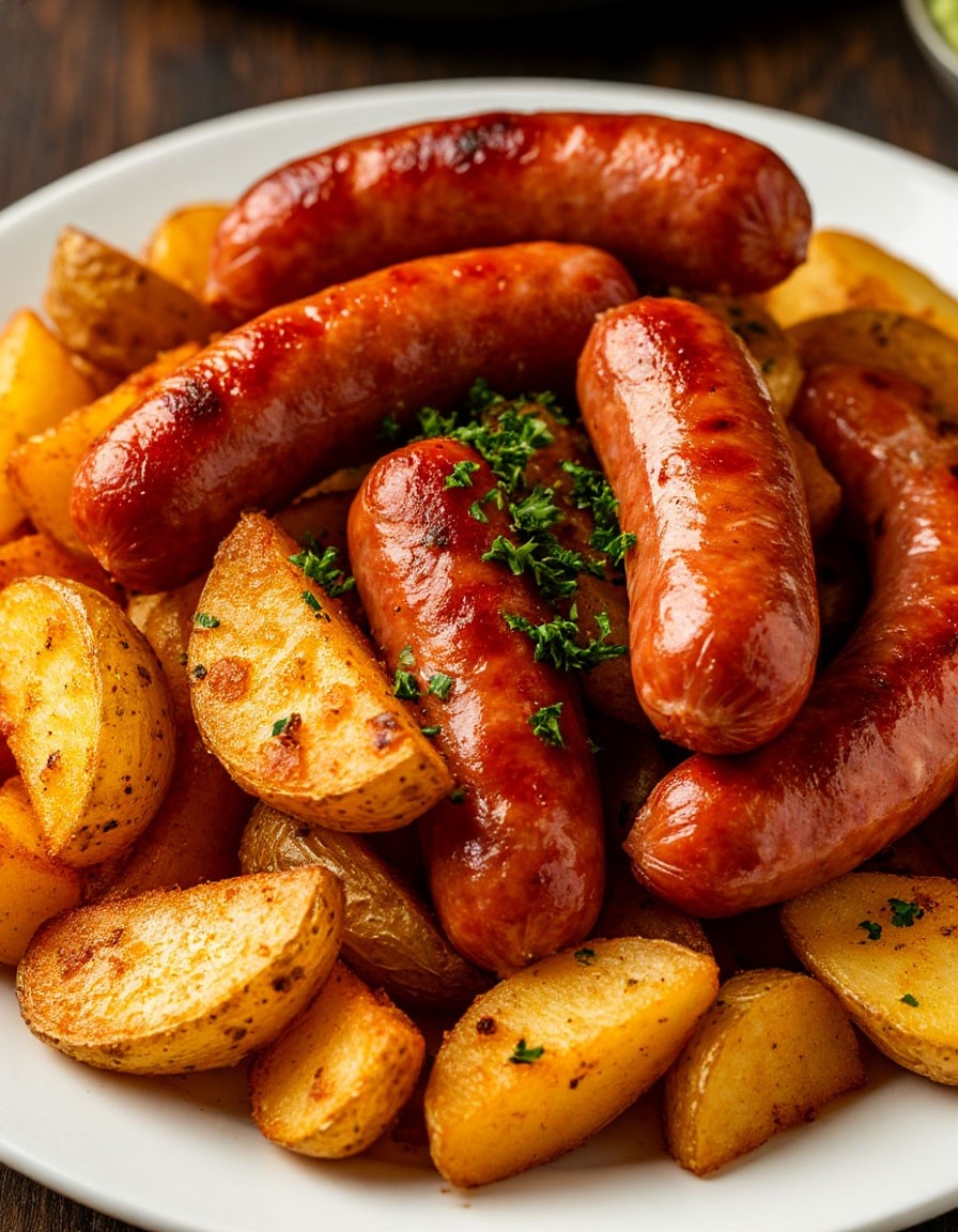 Подача: Целые сосиски удобно брать вилкой, а картошка дольками держит форму, но мягкая внутри. Идеально с горчицей или хреном.