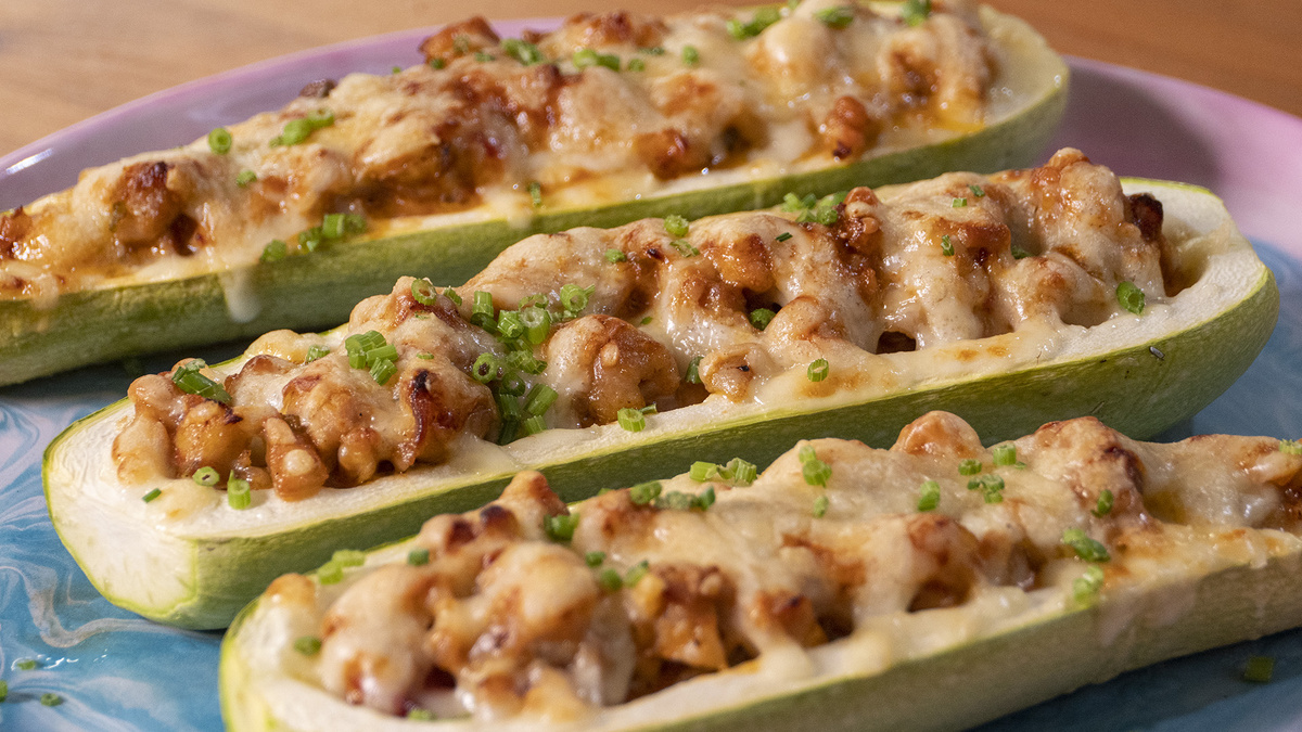 Ингредиенты: • Кабачки — 2 шт • Окорочок — 1,5 шт • Лук — 1 шт • Помидор — 1 шт • Чеснок — 1 зубчик • Сметана — 2 ст. л. • Лавровый лист — 2 шт • Сахар — щепотка • Соль, перец, чили — по вкусу • Стебли укропа • Вода, растительное масло • Сыр (для посыпки) Приготовление: Кабачки разрезаем вдоль, убираем сердцевину, формируя «лодочки». Выкладываем на противень с небольшим количеством воды и отправляем в духовку при 180°C на 10 минут. Мясо отделяем от костей, мелко режем. Обжариваем с луком и лавровым листом, солим, перчим. Добавляем нарезанный помидор, сметану и щепотку сахара. Перемешиваем, даём немного покипеть и снимаем с огня. Добавляем чеснок и при необходимости специи. Наполняем кабачки начинкой, сверху посыпаем тёртым сыром. Запекаем ещё ~10 минут до румяной корочки и подаём с укропом. Шеф-повар Василий Емельяненко ❗️Подписаться ❗️ https://t.me/+WiGqBwr7wQQxNGUy