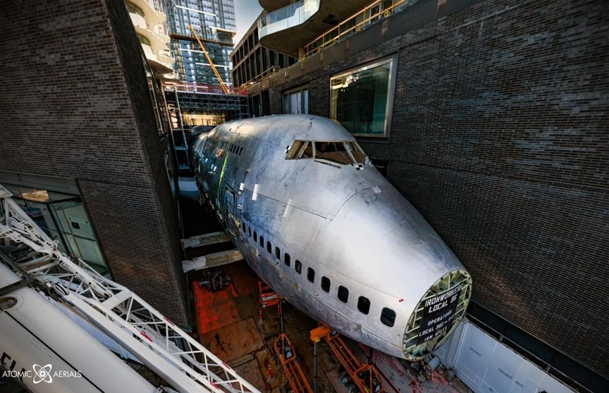 В Сиэтле между двумя строящимися зданиями поместили фюзеляж Boeing 747