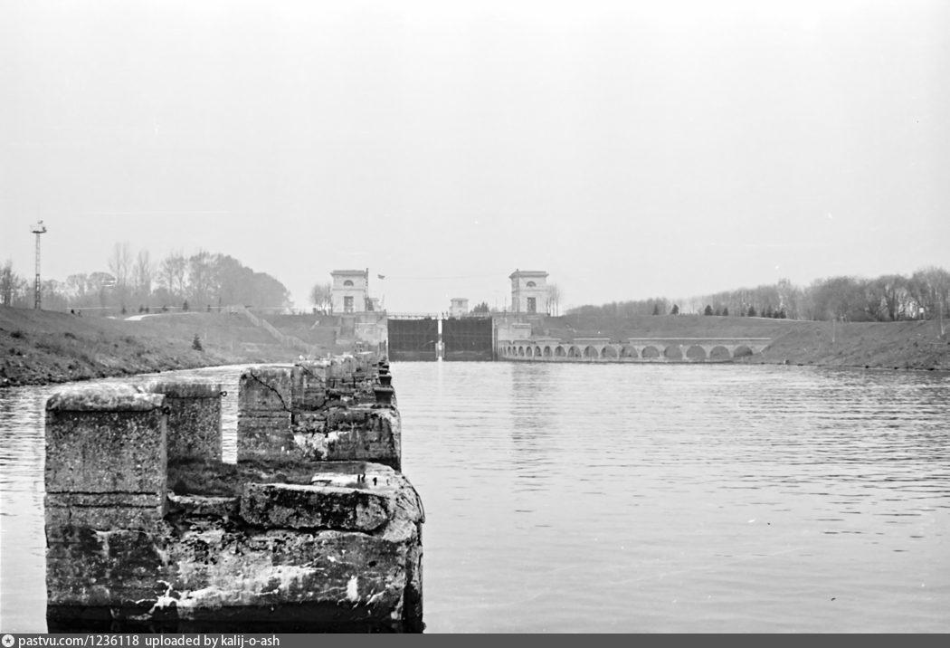 Москвы. Шлюз №1 Шлюзовые ворота почти закрылись.Слева - ряд причальных тумб для судов, ожидающих очереди на шлюзование. 📍 Шлюзовой переулок, Дубна, Россия 📅 Примерно 1989 год 📱 Мы в ВК #ИсторияФлота #PastVu