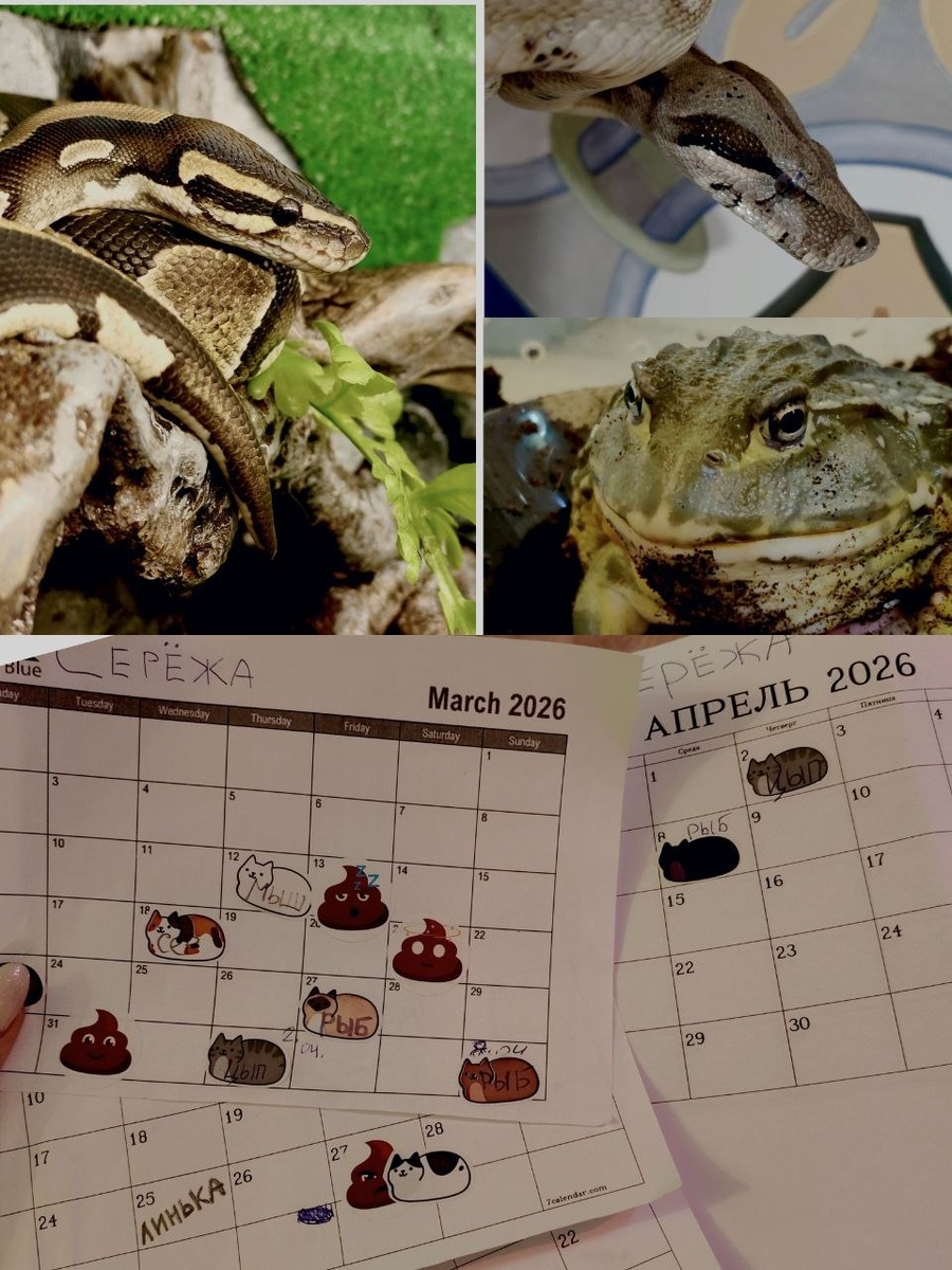 !) Всех с началом новой весенней недели! 👍🌿 Иногда меня спрашивают: как ты не забываешь, когда кого нужно кормить и тд?)) Раньше я всегда делала фото или видео, чтобы потом найти дату последнего приёма пищи того или иного питомца. Но одно дело - это еда.. А если ещё немаловажные вещи: например, линька у змей или... Туалетный вопрос))) 💩 Ну не буду же я фотографировать каждую какулечку?)) Для того, чтобы фиксировать важные моменты, было принято решение завести календари для каждого из ребят, кому требуется редкое кормление. А для удобного визуального восприятия были приобретены наклейки с забавной символикой)) Сначала я подрядила детёныша заниматься этим весёлым наклеечным делом, но процесс ему быстро наскучил, и теперь наклеечками 💩 балуюсь я сама 😃 А как вы сделите за режимом питомцев?))