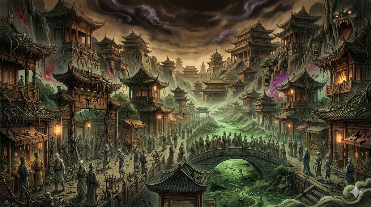 Прежде чем начать, важно понять одну вещь. В китайской традиции загробный мир огромен. Есть 冥界 (míng jiè — мир тьмы) — весь мир мёртвых, где есть и райские земли, и пустоши, и другие измерения. Но сегодня мы поговорим не о нём целиком.