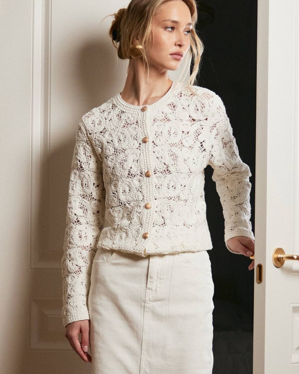 Белый ажурный кардиган из хлопка — как раз из таких. Полупрозрачная текстура играет со светом, прямой силуэт сохраняет чистоту линий, а металлические пуговицы добавляют акцент. Больше кардиганов в магазинах и на сайте BULMER