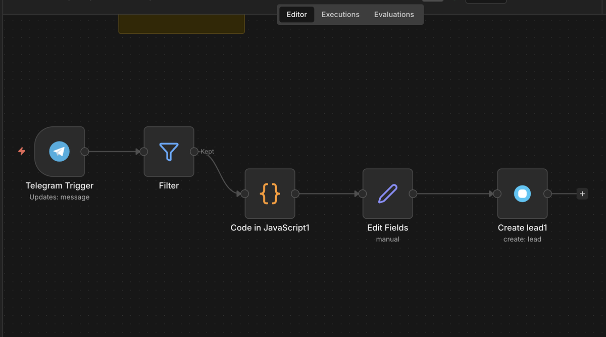 Как работает: Мы создаём бота и получаем на него токен через BotFather. Но вместо подключения к Открытой линии, токен передаётся в n8n. В n8n настраивается workflow, который обрабатывает входящие сообщения и через API отправляет данные в Битрикс24 (создаёт лид, сделку, контакт). Факт согласия при этом можно сохранять в отдельную таблицу или передавать в поле CRM .
