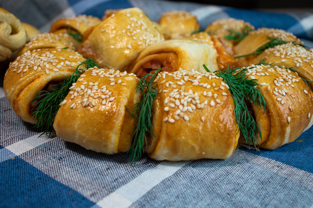 - Каждый кусочек смазываем соусом, слегка присыпаем орегано. - На край выкладываем ветчину и сыр, после чего сворачиваем в плотный рулет. - Перекладываем рулетики в форму, смазываем взбитым яйцом и посыпаем кунжутом. - Раскатываем второй пласт теста и также смазываем с