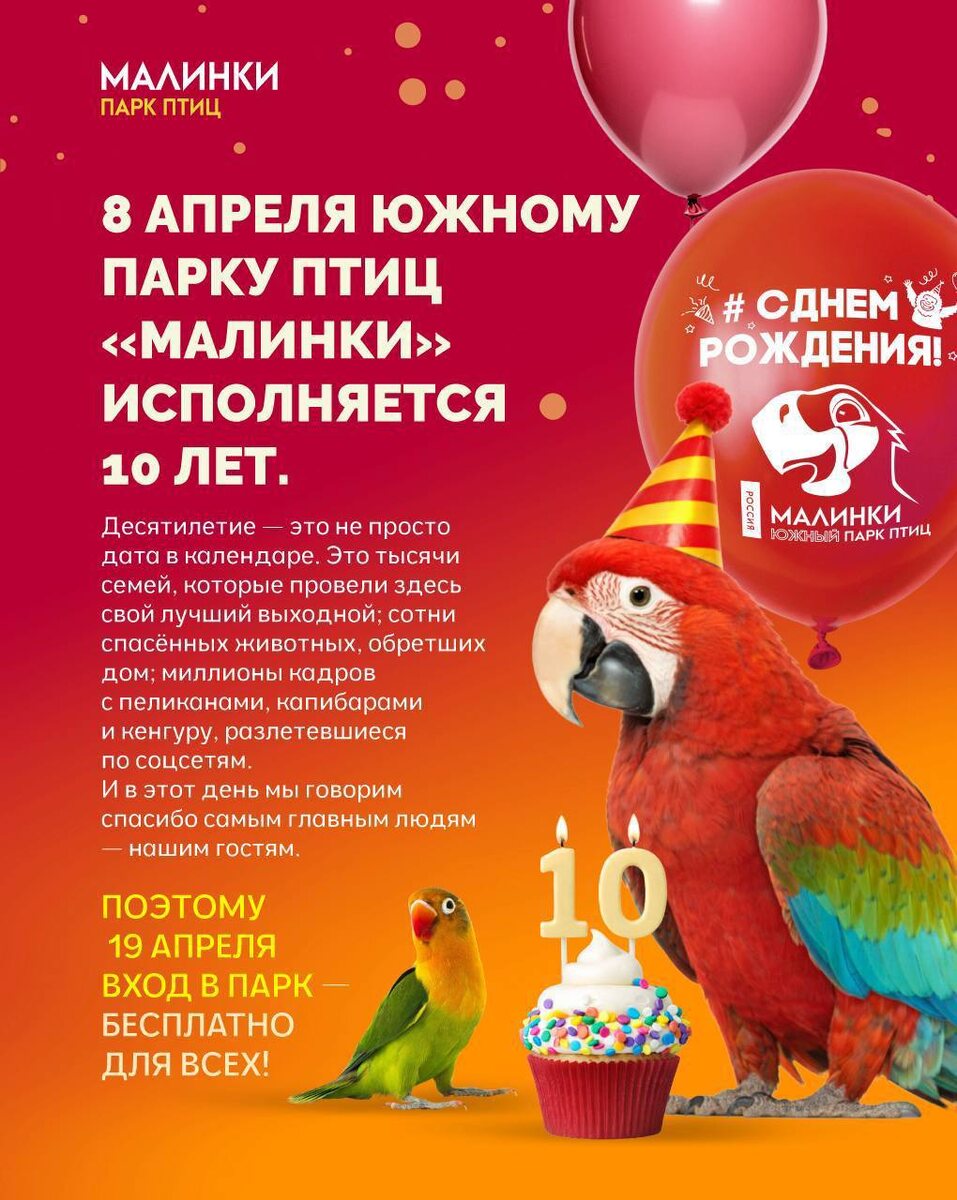 19 АПРЕЛЯ. ВХОД БЕСПЛАТНЫЙ - ВЕСЬ ДЕНЬ! ДЛЯ ВСЕХ. Десять лет назад здесь было чистое поле у трассы М4. Никаких вольеров, никаких дорожек, никаких пеликанов, которые кричат тебе навстречу с воды. Просто донская степь, горизонт и наша большая, немного безумная мечта — сделать на юге России место, где природа живёт не за стеклом, а прямо рядом с тобой. Где дети трогают мир руками. Где медведица из Приморья находит дом. Где каждый год рождается полторы тысячи новых жизней — тихо, просто потому что здесь для этого созданы все условия🥹 Десять лет эта мечта росла — и росла вместе с вами.🔥 Вы приезжали первый раз — и возвращались снова. Привозили детей, которые со временем стали приводить сюда своих. Фотографировали попугаев, которые садятся прямо на руку, кормили лемуров с ладони, оставались с ночёвкой на берегу озера. Вы не просто посещали парк — вы делали его живым.😍❤️🌷 19 апреля Малинки празднуют десятилетие так, как и должны — вместе с вами. Вход в этот день бесплатный для каждого