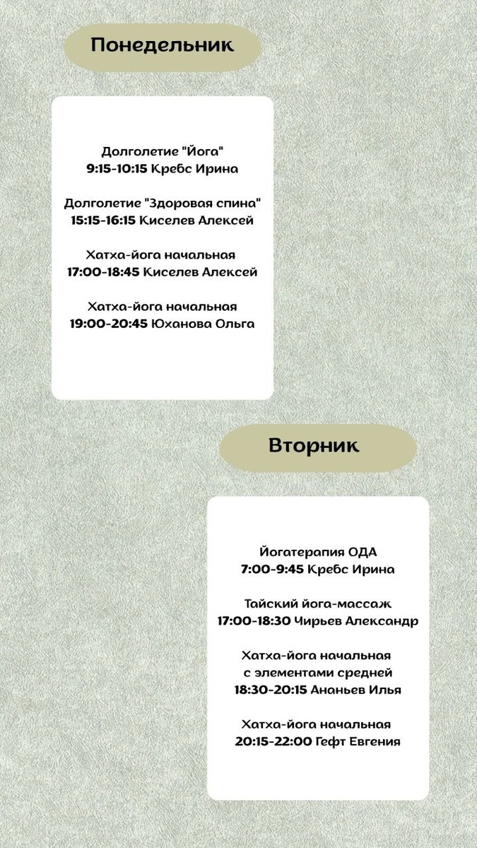 ❤️ Расписание на 13-19 апреля Ждём каждого практикующего на наших классах очно и онлайн🙏 Обратите внимание на изменения в расписании ↗Олеся Винниченко в отпуске до 15 апреля Запись на нашем сайте *Запись на большинство классов возможна после предоплаты. Купить разовое занятие или абонемент вы можете в разделе стоимость
