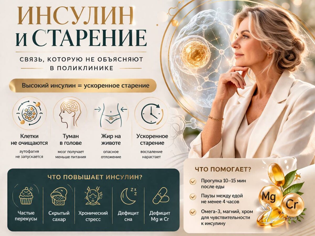 В практике я постоянно вижу одно и то же: усталость, набор веса, «туман» в голове, давление. И чаще всего это списывают на возраст. Но в основе — хронически повышенный инсулин. Инсулин — это не просто про сахар. Это гормон, который переключает организм: либо в режим накопления (жир, воспаление, старение), либо в режим восстановления (очищение, регенерация, энергия). Когда инсулин постоянно высокий — не запускается аутофагия, клетки не очищаются, ускоряется старение. После 40–45 лет снижается чувствительность к инсулину — развивается инсулинорезистентность. Инсулин повышен постоянно, организм не восстанавливается. Как это проявляется: сонливость после еды тяга к сладкому рост живота туман в голове сложности со снижением веса повышение давления Это не «возраст». Это метаболика. Что повышает инсулин: частые перекусы, скрытые углеводы, стресс, недосып, дефициты магния и хрома Хорошая новость — это обратимо. Что помогает: паузы между едой 3–4 часа, движение после еды, нормализация сна,
