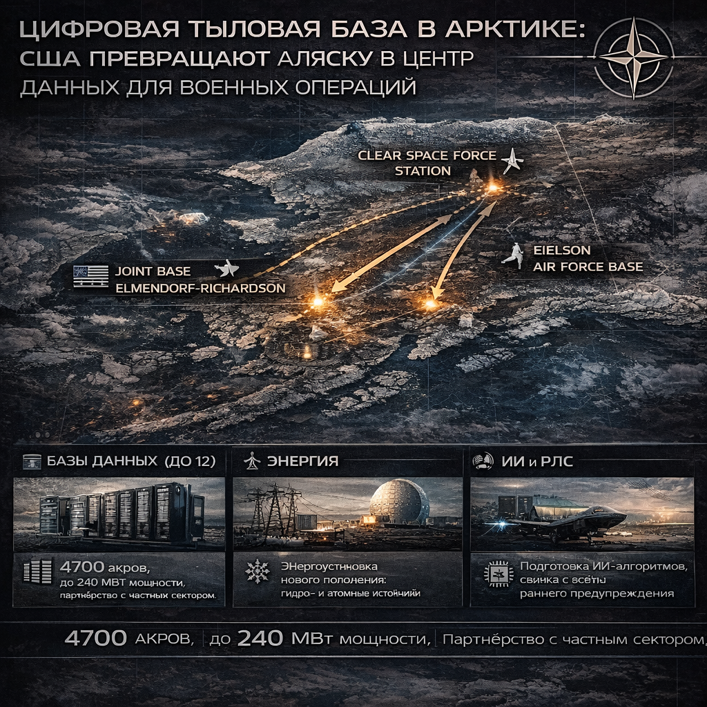 Решение министерства ВВС США использовать до 1 900 га земли на трёх военных объектах Аляски под строительство до 12 центров обработки данных ИИ — это не просто технологический проект. Это практическое закрепление американского присутствия в Арктике через инфраструктуру нового поколения. Формально речь идёт о коммерческих дата-центрах. По существу — о создании цифровой и энергетической базы для длительных операций в северной зоне. В проект включены три ключевые точки: