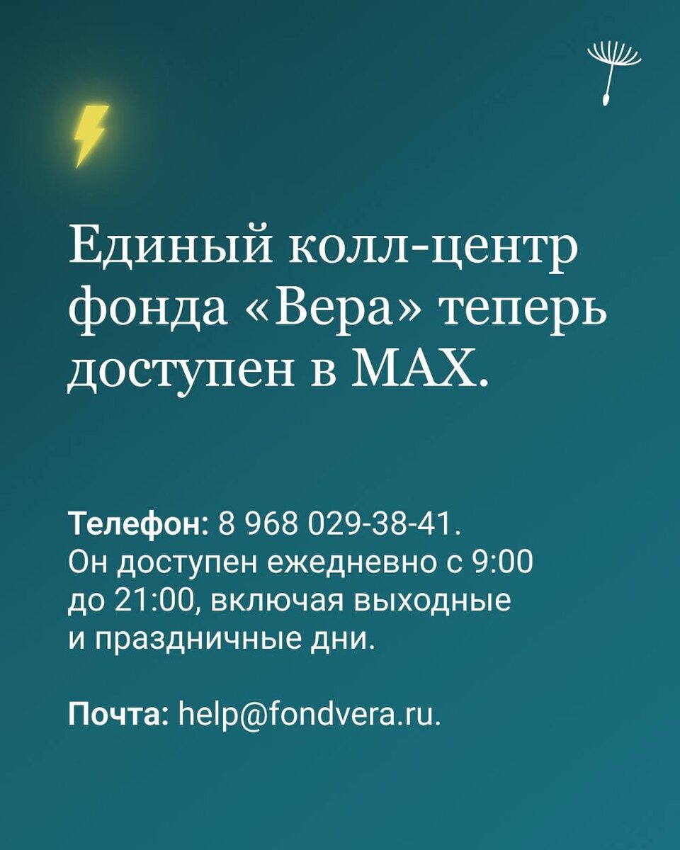 Телефон (MAX) колл-центра: 8 968 029-38-41. Он доступен ежедневно с 9:00 до 21:00, включая выходные и праздничные дни. Почта: help@fondvera.ru. К нам можно обратиться, если: