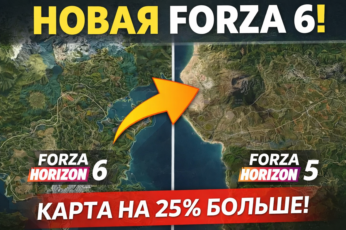 Forza Horizon 6 стала больше. Но важнее другое Недавняя презентация Forza Horizon 6 дала игрокам первый полноценный взгляд на карту, и сразу же начались сравнения с предыдущей частью. Контент-мейкер HokiHoshi подошёл к этому максимально точно: он не просто сравнил изображения, а буквально выровнял масштаб карт, взяв за основу 1 километр трассы в обеих играх. После этого он вручную очистил карты от лишнего — убрал океаны, горы и недоступные зоны, чтобы оценить именно игровое пространство. Такой подход позволил получить максимально честный результат. Итог оказался любопытным: карта Horizon 6 примерно на 25% больше, чем в Forza Horizon 5. На бумаге цифра звучит неплохо. Но главный сюрприз не в этом. Если вспомнить Forza Horizon 5, у неё была одна особенность, которую многие чувствовали, но редко формулировали прямо. Карта казалась больше, чем она ощущалась на деле. Причина проста: значительная часть территории представляла собой довольно ровные пространства. Центральные регионы, несмотр