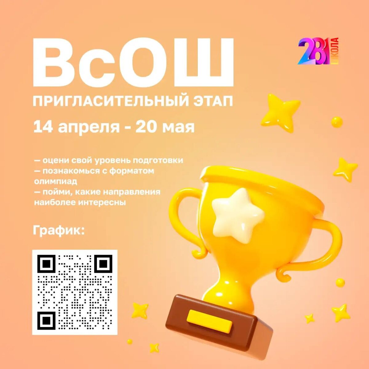 🏆 С 14 апреля по 20 мая 2026 года пройдет пригласительный этап Всероссийской олимпиады школьников в дистанционном формате на платформе МЭШ. К участию приглашаются обучающиеся 3–10 классов. На выполнение заданий по каждому предмету отводится 2 дня. Принять участие можно сразу в нескольких предметах! 📅 График проведения: — 14–15 апреля: экономика, немецкий язык — 15–16 апреля: литература, физическая культура — 16–17 апреля: астрономия, итальянский язык — 17–18 апреля: география, русский язык — 20–21 апреля: английский язык — 21–22 апреля: физика — 22–23 апреля: искусство (МХК), испанский язык — 23–24 апреля: химия — 24–25 апреля: информатика (робототехника), китайский язык — 27–30 апреля: французский язык, биология, технология, ОБЖ — 5–6 мая: обществознание — 12–16 мая: право, математика, экология, информатика — 15–16 мая: история — 18–20 мая: информатика (программирование) ✨ Рекомендуем ребятам попробовать свои силы в разных предметах, чтобы: — оценить свой уровень подготовки — по