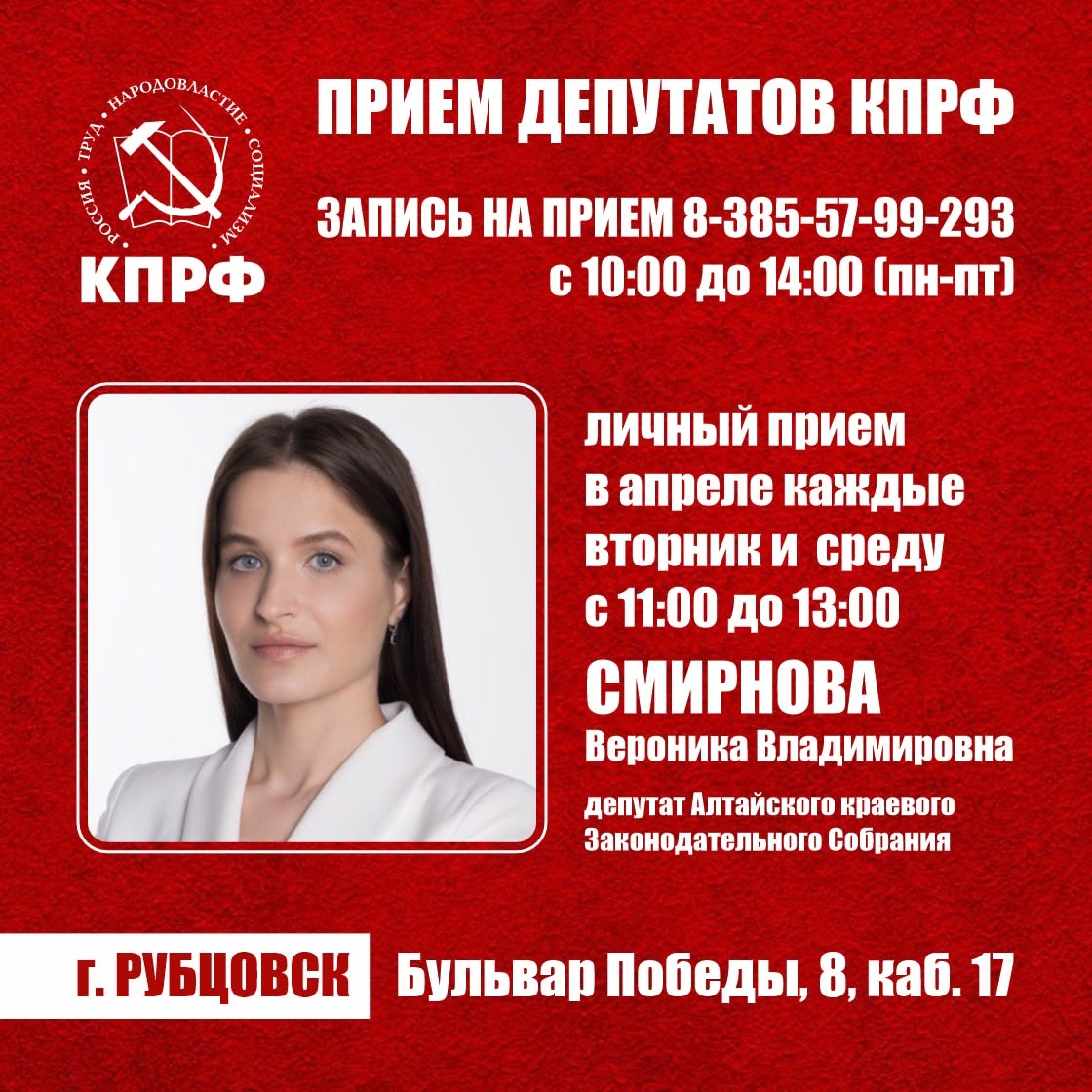 Рубцовск, Бульвар Победы, 8, каб. 17 тел. 8 385 57 9-97-36 📌В апреле каждые вторник и среду, с 11:00 до 13:00 СМИРНОВА Вероника Владимировна депутат Алтайского краевого Законодательного Собрания