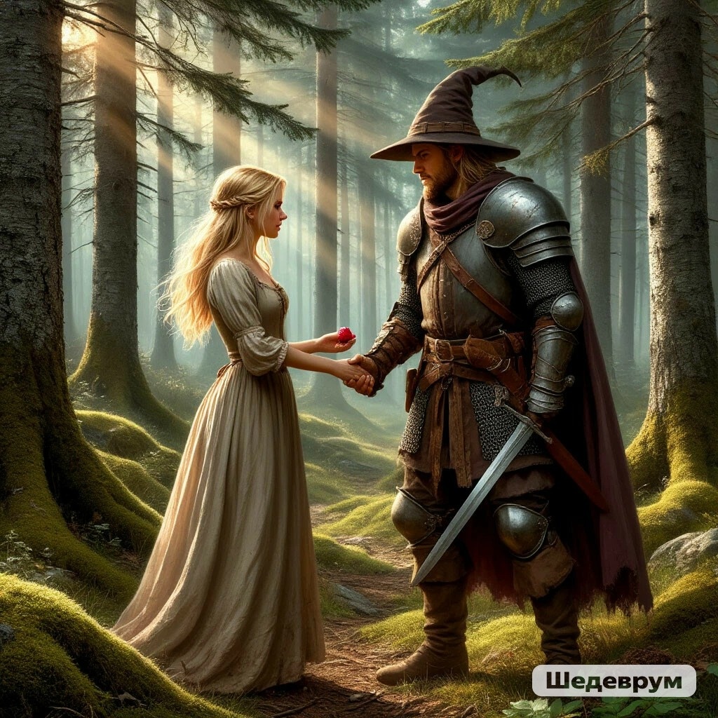 В самой глухой чаще, где сосны помнят времена, когда людей ещё не было, жила Она. Молодая, светловолосая, с глазами цвета болотных огней. Её называли ведуньей, дочерью ветров, хранительницей древних слов. Местные боялись и шептались, но по ночам тайком несли к её порогу хлеб и просьбы. Она не пряталась. Просто жила в ладу с тем, что другие забыли. В канун Имболка она плела из сухих трав узоры и звала весну — под звон серебряных колокольчиков, вплетённых в дверной проём. На Самайн жгла костры, и пламя лизало небо так, что волки садились вокруг круга и пели. Сердце её было спокойно. Сто лет, двести — она привыкла к одиночеству. Но в последнее время что-то щемило под рёбрами, как будто пророчило. Кругом шла голова от наплыва мыслей, а по ночам снился чужой твёрдый шаг. Он пришёл на рассвете. Рыцарь без плаща, охотник с выжженным орденским клеймом на плече. Ему заплатили, чтобы он стёр с лица земли «колдовскую тень». Он шёл по следу три недели. Лес его путал, тропы исчезали, но он поклял