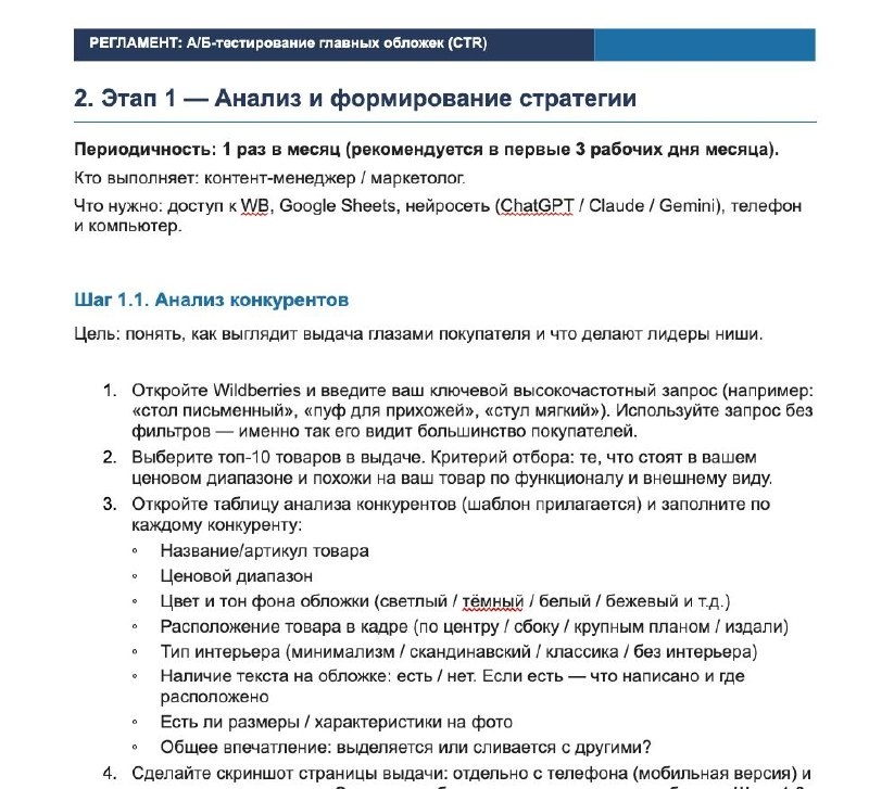 Вырос - значит сработало. Нет. Это главная ошибка, которая съедает рекламный бюджет незаметно. Мы написали самый полный регламент по А/Б-тестированию обложекек для внутреннего пользования компаний. Полноценный рабочий документ - не "советы из интернета", а то, что реально работает у нас в производственном бизнесе прямо сейчас. Сначала главная аксиома, которая стоит в самом начале регламента: Рост CTR - хорошо только если CR не упал. Объясняю на пальцах. CTR - это дверь. CR - это то, заходят ли в неё. Ты нарисовал красивую дверь, народ начал кликать. Зашёл - и увидел не то, что ожидал. Ушёл. Ты заплатил за клик, который не конвертировался. ДРР вырос. Стало хуже, чем было до теста. Это называется кликбейт. И это не редкость - это норма у большинства. Что внутри регламента и почему он закрывает большинство дыр в работе с обложками. Там четыре этапа. Первый - анализ конкурентов и поиск слепых зон выдачи. Если 90% конкурентов снимают мебель на тёмном фоне - это слепая зона. Твой ша
