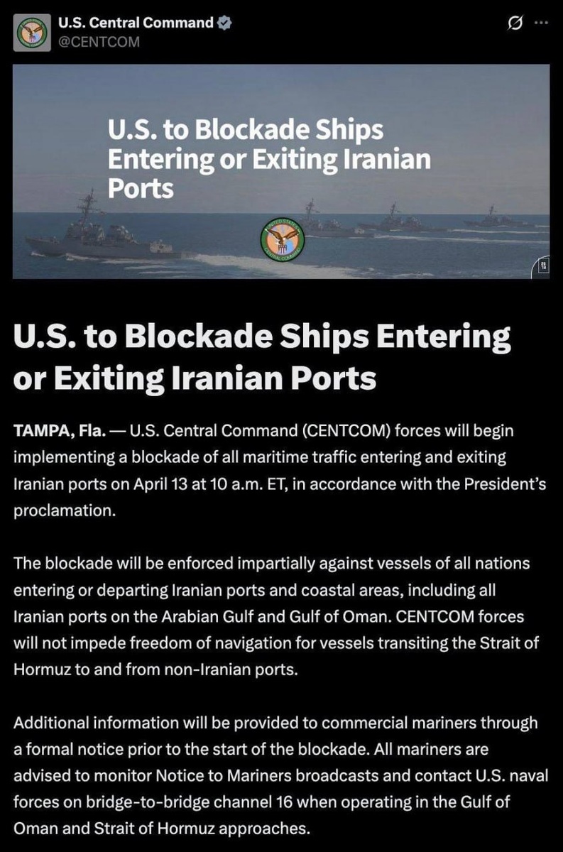 ⏺Под ограничения попадают ВСЕ суда, заходящие в иранские порты или выходящие из них — независимо от флага государства. Блокада будет действовать в акватории Аравийского моря и Оманского залива. ⏺Исключение — транзит через Ормузский пролив: CENTCOM не будет препятствовать судам, следующим в порты других стран и обратно. ⏺ Ситуация накаляется. Следим за развитием событий. #ВМС #блокада #Иран #США #CENTCOM #ОманскийЗалив #АравийскоеМоре #ОрмузскийПролив #морскаяБезопасность #геополитика Галопом по Европе