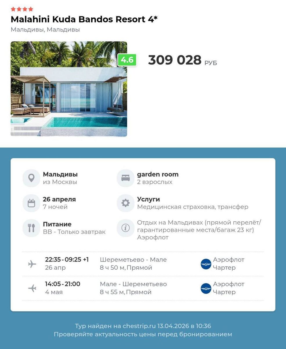 😉 Ту самую: желанную, прозрачную, солёную, бесконечную – Мальдивскую, в которой растворяется усталость. Готовы утолить жажду? Подборка на Мальдивы с прямым перелётом в конце апреля ⬇️ 🏠 MALAHINI KUDA BANDOS RESORT 4⭐️ ✈️ Москва ➡️ Мальдивы, Мальдивы ✈️ 26 апр, 22:35 - 09:25 +1, Аэрофлот ✈️ 4 мая, 14:05 - 21:00, Аэрофлот 📅 26 апр, 🌙 7нч 🛌 garden room, 2взр 🍽 Завтрак 🏷️ 309 028 руб 🏠 FIHALHOHI MALDIVES (EX. FIHALHOHI ISLAND RESORT) 4⭐️ ✈️ Москва ➡️ Мальдивы, Мальдивы ✈️ 26 апр, 22:35 - 09:25 +1, Аэрофлот ✈️ 4 мая, 14:05 - 21:00, Аэрофлот 📅 26 апр, 🌙 7нч 🛌 deluxe sky, 2взр 🍽 Завтрак, Ужин 🏷️ 325 166 руб 🏠 BANDOS MALDIVES (EX. BANDOS ISLAND RESORT) 4⭐️ ✈️ Москва ➡️ Мальдивы, Мальдивы ✈️ 25 апр, 22:35 - 09:25 +1, Аэрофлот ✈️ 2 мая, 11:05 - 17:50, Аэрофлот 📅 25 апр, 🌙 6нч 🛌 standard beachfront room, 2взр 🍽 Завтрак, Обед, Ужин 🏷️ 340 887 руб 🏠 KUREDU ISLAND RESORT 4⭐️ ✈️ Москва ➡️ Мальдивы, Мальдивы ✈️ 26 апр, 22:35 - 09:25 +1, Аэрофлот ✈️ 4 мая, 14:05 - 21:00, Аэро