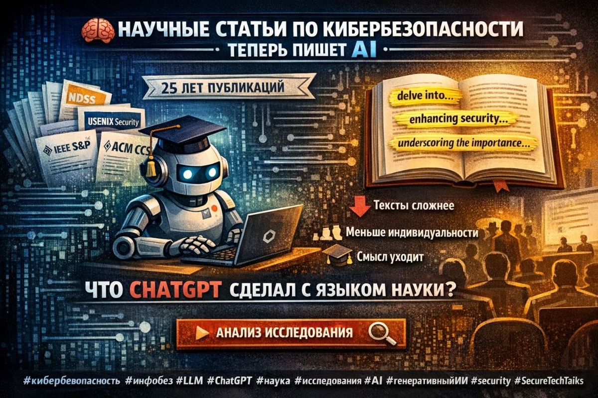 Есть свежее исследование, которое анализирует 25 лет научных публикаций в журналы и топовые конференции: NDSS, USENIX Security, IEEE S&P и ACM CCS. 👉 Давайте разберемся, что ChatGPT сделал с языком науки? 📉 Что изменилось? После 2022 года тексты начинают меняться. Они становятся длиннее, тяжелее и заметно хуже читаются. Длина слов растёт, а язык постепенно уходит в сторону перегруженного «академического» стиля. Появляется новый характерный «акцент», в виде маркерных слов: delve into…, enhancing security…, underscoring the importance… AI не делает текст более понятным, текст становится более формальным, но менее живым. Таким образом, мы начали оптимизировать не смысл, а звучание. Можно наблюдать странный эффект: статьи становятся «правильными», но их всё сложнее читать и ещё сложнее запоминать. 🧩 Второе дно AI начинает стандартизировать мышление через язык. Когда у всех один и тот же помощник, исчезает индивидуальность, пропадает авторский стиль. Тексты становятся взаимозамен