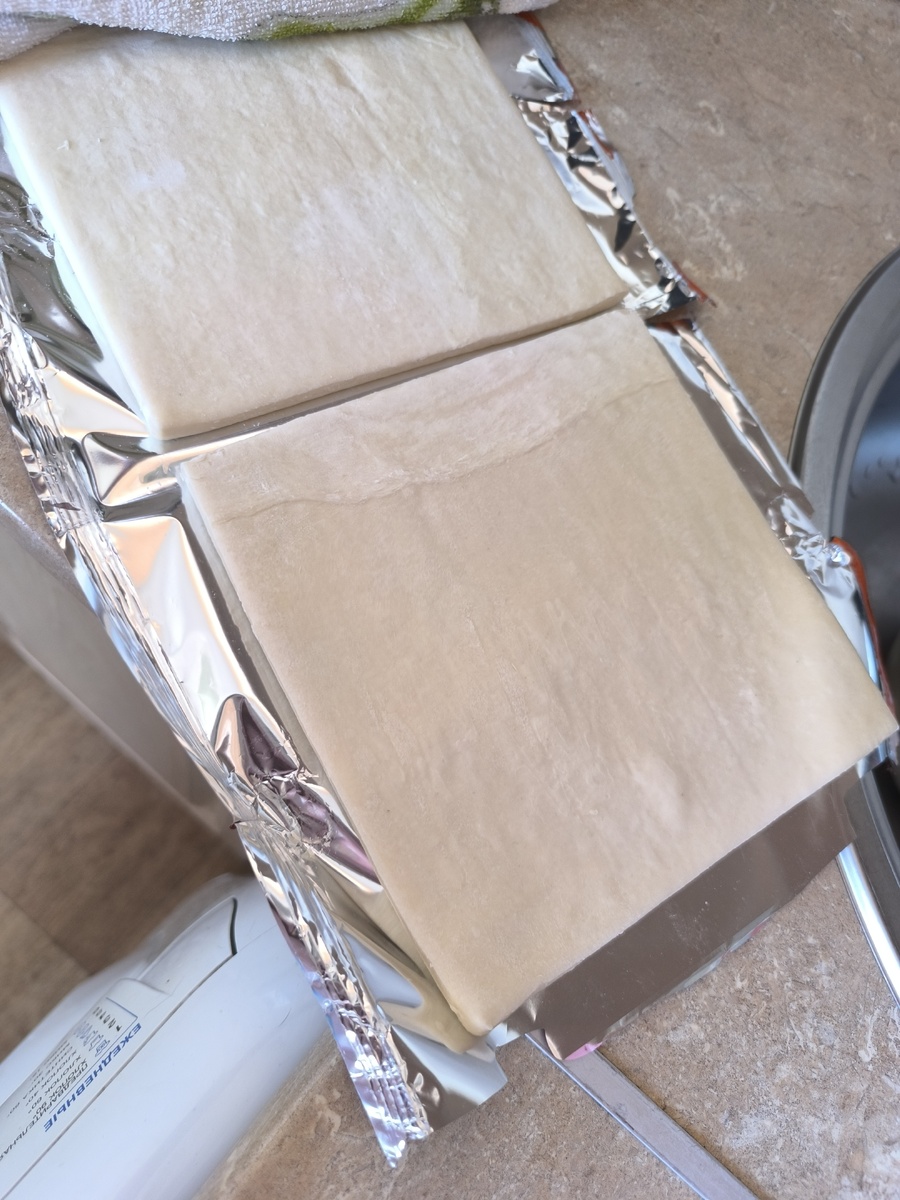 Теперь вы будете понимать, какой бюджет у вашего вкусного блюда. 1. Тесто раскрыть и отделить пластины друг от друга. Оставить на час под полотенцем, чтобы растаяло и немного поднялось. Изюм в это же время залить кипятком, чтоб набух. 2. Через час с изюма слить воду и обсудить его салфеткой. Смешать творог (можно предварительно пробить блендером) с изюмом и сахаром. Белок отделить от желтка и ввести в творог. Желток оставить для обмазки теста. 3. Обе пластины теста делю на равные 4 части, получаю 8 квадратов. 1 вид. Разрезаю уголком с двух углов и перекладываю между собой. Тесто хорошо прижимаю, чтобы начинка не вытекала. Наполняю творогом. 4. 2 вариант. Взглядом делю квадрат на две части. В одной делаю три надреза (сколько хотите), на вторую половину выкладываю начинку. Края соединяю вилкой, чтоб начинка не вытекала. 5. Желток смешиваю с каплей молока и этой смесью смазываю открытые места слоек. В разогретую духовку на среднем уровне режим верх-низ на 180° на 20 минут. Потом на 200° р
