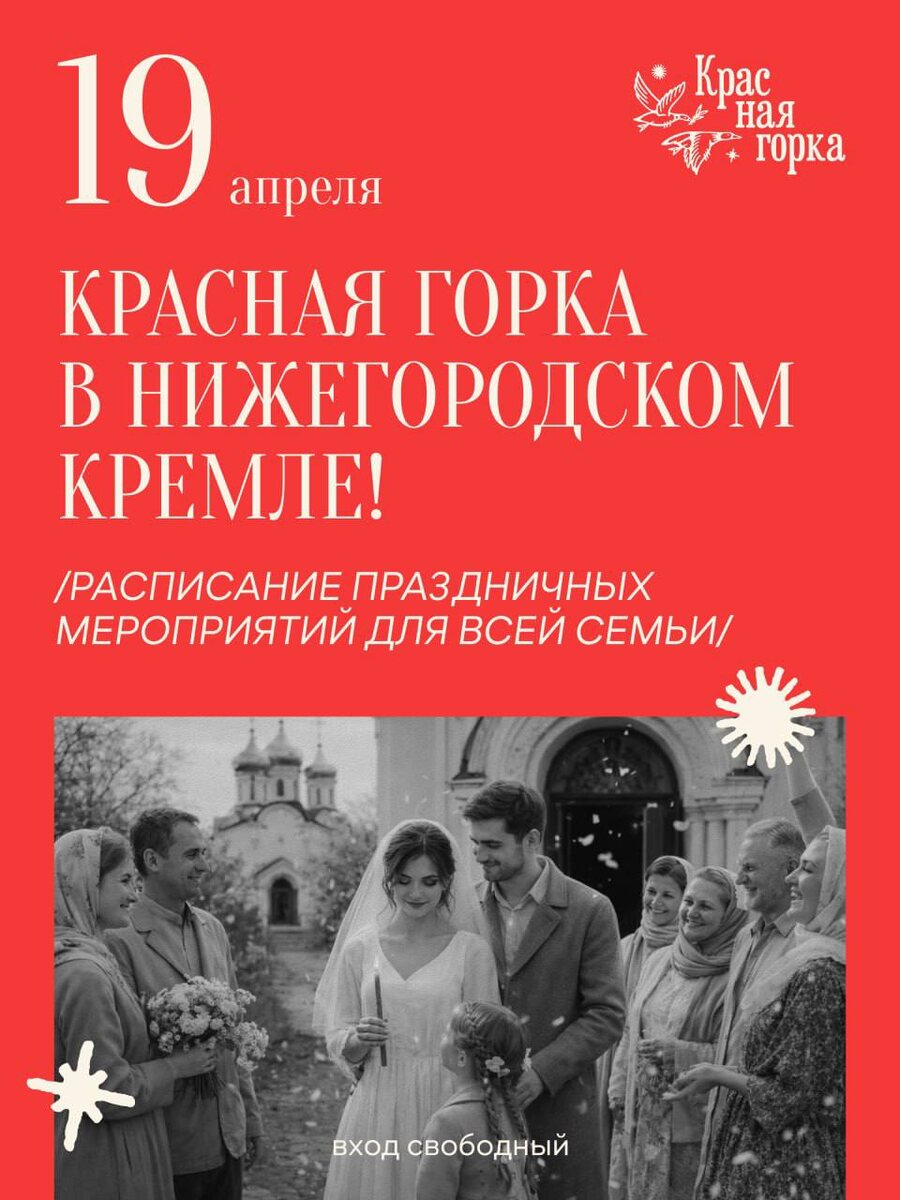 Красная горка по-семейному! 19 апреля пройдёт большой фестиваль, посвящённый Антипасхе. В народе этот светлый день называют Красной горкой — он наступает в первое воскресенье после Пасхи и дарит особенное чувство обновления и душевного тепла. На площадках Нижегородского кремля каждый сможет найти занятие по душе. Приходите всей семьёй! Программа фестиваля — в карточках. Вход свободный, но лучше пройти регистрацию. До встречи в Кремле 💙 💙 Манеж (Кремль, 1 А) 💬 МАХ
