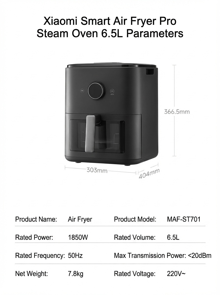 Смарт-кухня всё чаще становится частью нашей повседневной жизни. Новый Xiaomi Mijia Air Fryer Pro 6,5 л обещает упростить готовку, экономя время и здоровье, а также вписаться в уже знакомый экосистемой Xiaomi мир умных устройств. Это шестичастный воздушный фритюр с объёмом 6,5 литра, в котором объединены функции жарки горячим воздухом, паровой готовки и выпечки. Модель MAF‑ST701 оснащена 1850 Вт нагревателем и отдельным парогенератором в 900 Вт, что даёт возможность готовить на 130 °C паром, ускоряя процесс на 30 % и сохраняя сочность продуктов. Корзина выполнена в виде трёхмерного циклона, а внутри находится двойная решётка‑гриль. Благодаря такому дизайну еда готовится равномерно, без необходимости в ручном переворачивании. Габариты прибора – 404 × 303 × 366,5 мм, вес ≈ 7,8 кг. Он работает от сети 220 V ~ 50 Hz, что характерно для большинства стран Азии. Внутренняя полость покрыта нержавеющей сталью 304‑го сорта и покрытием без фтора (0 % фтор), так что запаха от пищи и риска химическ
