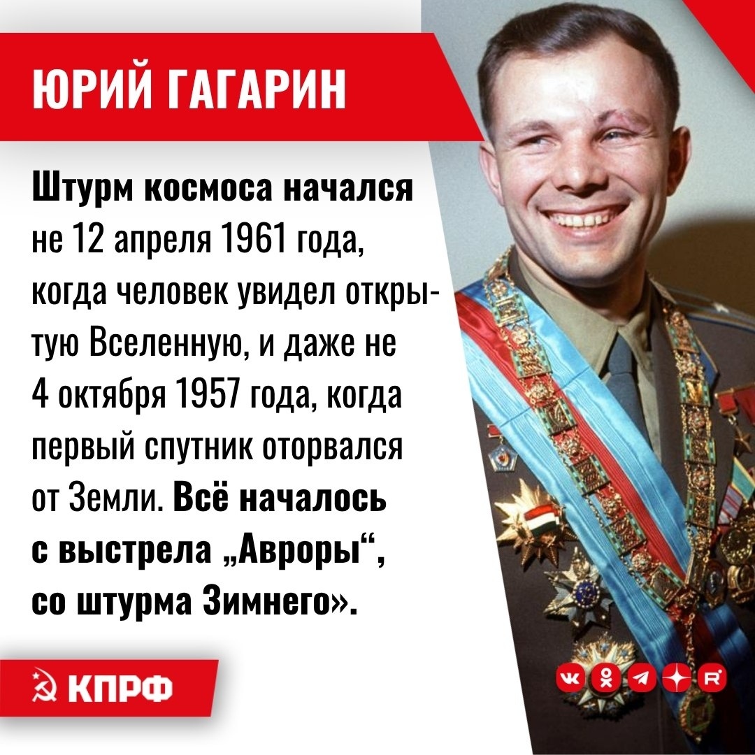 Дорогие товарищи, мои друзья! 65 лет назад, 12 апреля 1961 года, произошло грандиозное историческое событие. Мир облетела весть — человек в космосе! Героем, совершившим тот великий полёт, стал советский офицер, русский коммунист Юрий Алексеевич Гагарин. Победив фашизм, наш народ с несгибаемой волей и самоотверженностью возрождал разрушенную страну. Этот подвиг был увенчан событием поистине былинного масштаба. Вслед за Великой Победой 1945 года мир вновь поразился свершениям нашей социалистической Родины. Космическая Победа стала закономерным этапом развития советской цивилизации. Её истоками были Великий Октябрь, ленинско-сталинская модернизация, создание мощной науки, образования и производства, стремительный интеллектуально-культурный рост нашего народа. Полёт Юрия Гагарина длился всего 108 минут, но стал судьбоносным событием в биографии человечества. Первый советский космонавт стал подлинным послом мира. Миллионы людей планеты спешили на встречи с ним — от рабочих и студентов до гл