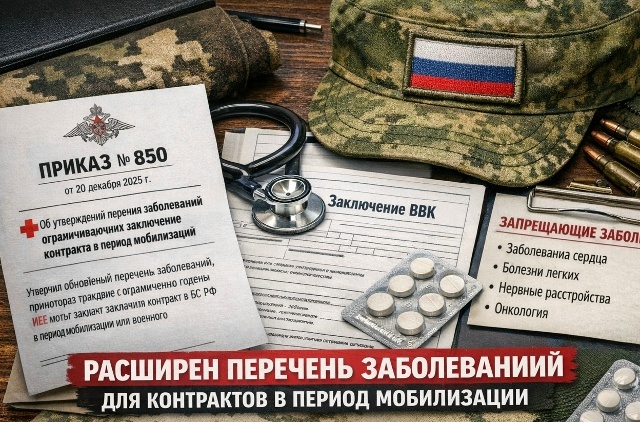 🚑 Приказ МО РФ № 850 от 20.12.2025 (опубликован 30.01.2026) утвердил обновлённый перечень заболеваний, при которых граждане с категорией «ограниченно годен» НЕ могут заключить контракт в ВС РФ в период мобилизации или военного положения.