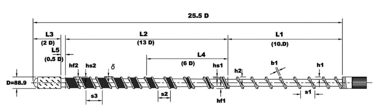 Проблема: В производстве трехслойной соэкструдированной рукавной пленки для упаковки и сельскохозяйственного применения использовался экструдер 55 мм (L/D = 25,5) для подачи наружного слоя из LLDPE. Возникла необходимость значительного увеличения производительности (более чем в 2 раза) для обеспечения требуемой структуры пленки. Ограничения: Фактический 55-мм экструдер с барьерным шнеком не мог обеспечить более высокую производительность без чрезмерного повышения температуры расплава, что негативно влияло на качество пленки. Операторы завода были хорошо знакомы с рабочими окнами 55-мм экструдера и не хотели осваивать принципиально новое оборудование. Температура расплава должна оставаться в допустимых пределах для стабильного охлаждения пузыря и калибровки пленки. Цель: Спроектировать новый экструдер большего диаметра, который сохранит: Постоянное соотношение L/D (25,5) Хорошее плавление LLDPE Приемлемые температуры расплава Знакомые операторам рабочие параметры 🔍 Анализ Под