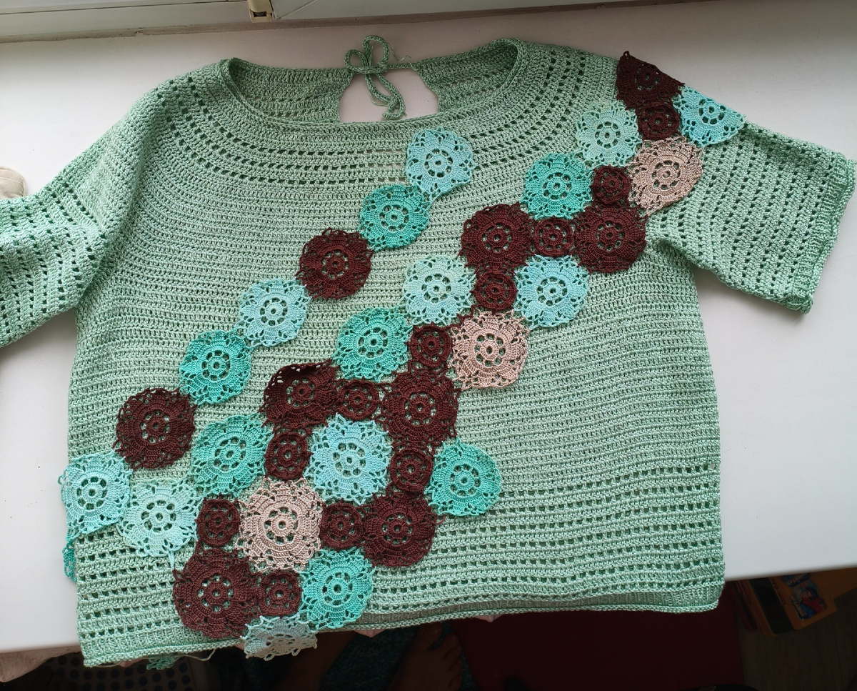 Он связан круглой кокеткой по такому же МК как и топ Мятный. (И розовая футболка с бусинами)