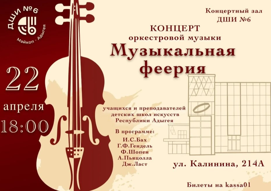» 22 апреля в 18:00 в Концертном зале Детской школы искусств №6 состоится концерт «Музыкальная феерия». 🎵В программе концерта – оркестровая музыка разных стилей и жанров: от барокко и классицизма до джаза. Произведения И. С. Баха, Г. Ф. Генделя, Ф. Шопена, А. Пьяцоллы, Дж. Ласта и других композиторов, чьи имена вошли в сокровищницу мировой музыкальной культуры. На одной сцене объединятся преподаватели и обучающиеся детских школ искусств Республики Адыгея, составив сводный оркестр. Ждем всех любителей хорошей музыки! Билеты по ссылке 💬Минкульт Адыгеи в МАХ #новости_минкульт_РА #ДШИ