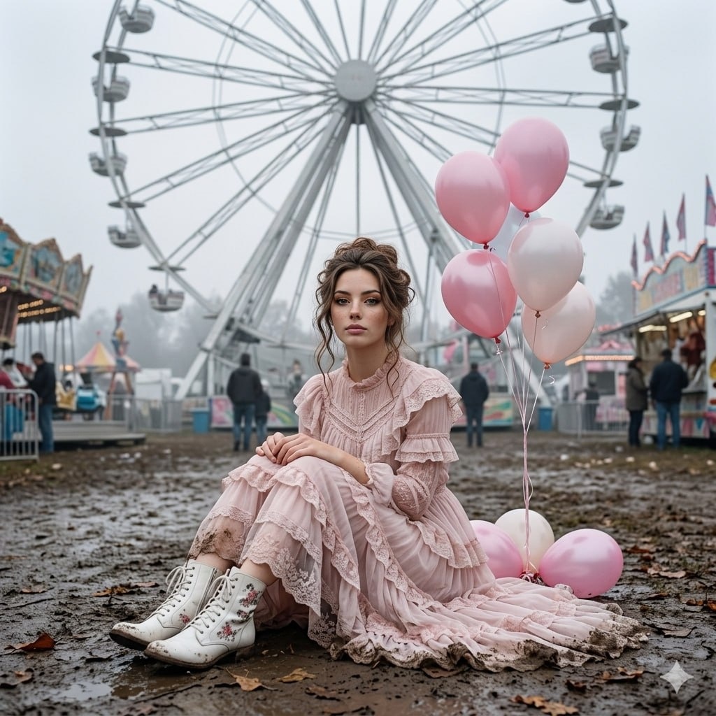 Когда там уже аттракционы открывают? портрет женщины, сидящей на мокрой земле перед большим колесом обозрения, портрет в полный рост, ракурс на уровне глаз, статичная композиция, **сохранить черты лица с загруженных референсных фото — форму лица, глаз, носа и губ передать максимально точно**, на ней длинное бледно-розовое платье с оборками и кружевом, высокие белые ботильоны с узором, рядом розовые воздушные шары, часть из которых лежит на грязной земле, вокруг карнавальная атмосфера — аттракционы и лотки, на фоне пасмурного неба и тумана, мягкий рассеянный дневной свет, падающий сверху и сзади, создающий нежные тени и атмосферу меланхолии. макияж: тени в нежных пастельных оттенках — персиковый, бежевый, светло-розовый, плавный переход к более тёмному тону во внешнем уголке глаза, чёрная подводка с лёгкой стрелкой, подчёркивающей форму глаз, длинные объёмные ресницы, густо покрытые чёрной тушью, губы покрыты нежным розовым глоссом с лёгким шиммером, кожа выглядит безупречно гладкой и