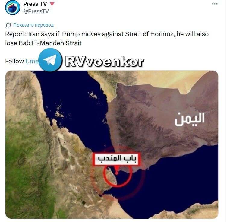 ▪️Ovo prenosi iranski kanal Press TV pozivajući se na izveštaj vlasti. ❗Do 6 procenata svetskog obima pomorskog transporta nafte prolazi kroz moreuz Bab el Mandeb. ▪️Krajem marta Huti su saopštili da je Jemen spreman da otvori drugi front kao podršku Iranu i blokira strateški moreuz Bab el Mandeb. ▪️Predsednik parlamenta Irana Galibaf još 4. aprila je takođe nagovestio da moreuz Bab el Mandeb može biti blokiran. ✅ Stevan II | Pojačajte nas