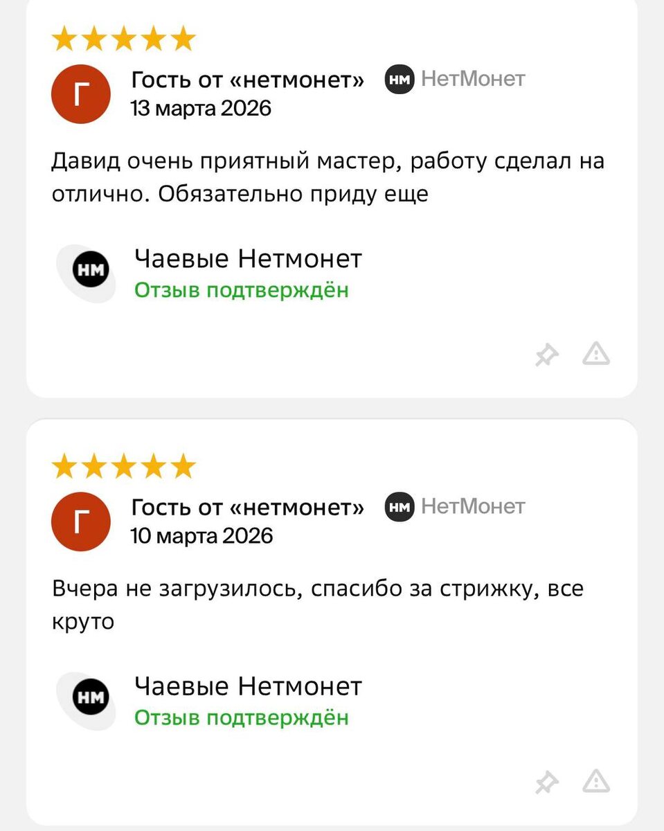 У чаевых Нет Монет есть прекрасная опция. Отзывы с них автоматом прилетают в вашу карточку 2Гис, тем самым повышая рейтинг. Весьма легко за мотивировать мастеров, ведь их чай напрямую зависит от действий гостя. В общем - пользуйтесь. Рекомендую🤘