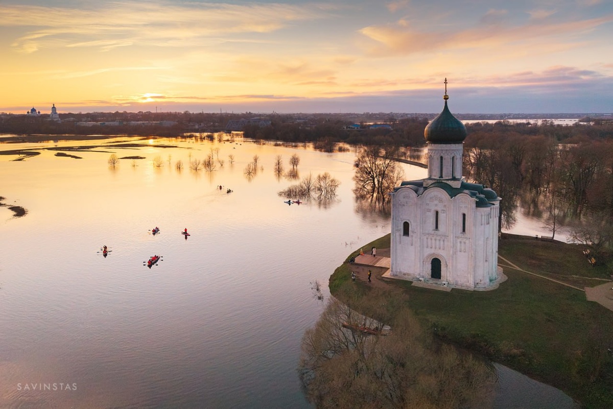 В какой момент тема сплава в разлив стала культовой — я не знаю. С одной стороны можно порадоваться, что народ таким образом приобщается к прекрасному и полезно отдыхает, с другой — снять кадр в выходной день крайне сложно, так как вся акватория заполнена резиновыми плавсредствами всех видов. Лишь на излёте заката можно побыть наедине с храмом...