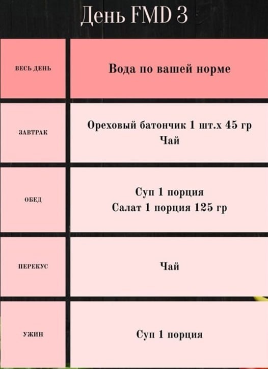 В третий, центральный день FMD протокола, у меня было 4 приема пищи.