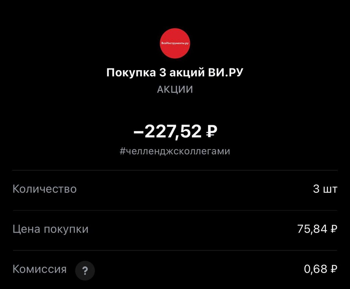 ! Сегодня покупка #395 с учетом оставшихся денег с прошлых сделок. Статистика портфеля на стороннем сервисе, можно посмотреть по "ссылке" Напомню это челлендж с коллегами, каждый рабочий день пополняем брокерский счет на 250 рублей и инвестируем. Если возникли вопросы или есть не понимание, что делать. Задавайте «тут» Покупка #395 🟢 «ВИ.РУ» 75.84 rub #VSEH 3 лота #каждыйсможет #челенджсколлегами TG MAX