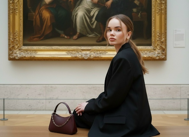 девушка с фото, лицо точно такое же, как на изображении: идентичные черты лица, строение костей, губы, нос, глаза и пропорции. Не изменять строение лица. Ультрареалистичная модная фотография, снятая в светлом художественном музее или галерее, на фоне большой классической живописной картины в массивной позолоченной резной раме; вокруг светлые стены, каменный цоколь и минималистичное выставочное пространство, создающее атмосферу тихой интеллектуальной роскоши, арт-эстетики и утонченной европейской элегантности. Ракурс камеры — на уровне сидящей модели, слегка сзади и сбоку, с фокусом на повороте корпуса и лице в три четверти. Кадрирование отхватывает модель от головы до линии бедер/сиденья, включая крупную часть картины целиком в верхней половине кадра и музейное пространство вокруг. Поза максимально точная: модель сидит на низкой музейной скамье спиной и корпусом в пол-оборота к камере, плечи расслаблены, спина прямая. Одна рука опущена вдоль тела и лежит рядом на скамье, другая также расслабленно находится возле бедра, рядом с небольшой сумкой. Голова резко, но изящно повернута через плечо назад к камере. Взгляд направлен прямо в объектив, выражение лица спокойное, немного задумчивое и кинематографичное. волосы распущенные, ю с мягким объемом, уложены на боковой пробор. Кожа выглядит чрезвычайно реалистично и без ретуши. Естественная зернистость кожи и микротекстура сохранены в высоком разрешении. Кожа выглядит тактильной, органичной и фотографической — не пластиковой, не восковой, не обработанной аэрографом. Текстура кожи сохраняет поры, зернистость кожи, микроконтраст и естественные несовершенства. Макияж: мягко очерченные скулы, естественно подведенные брови с эффектом ламинирования, выразительные длинные ресницы и блестящие нюдовые губы с видимой текстурой и естественными линиями. Образ: черный оверсайз-жакет или удлиненный блейзер с мягкой посадкой и свободными рукавами, надетый как основной акцент образа, без явного декора; небольшие выразительные серьги в винтажном стиле с золотистым блеском; рядом на скамье компактная кожаная сумка глубокого бордового оттенка с короткой ручкой и металлической цепочкой. Общий образ минималистичный, художественный, сдержанный и дорогой. Освещение выполнено мягким музейным интерьерным светом, равномерным и рассеянным, без жестких теней, с деликатной проработкой кожи, ткани жакета и фактуры золоченой рамы. Съемка производилась на профессиональную цифровую камеру с портретной оптикой, что позволило получить чрезвычайно детализированные текстуры и естественную передачу кожи.