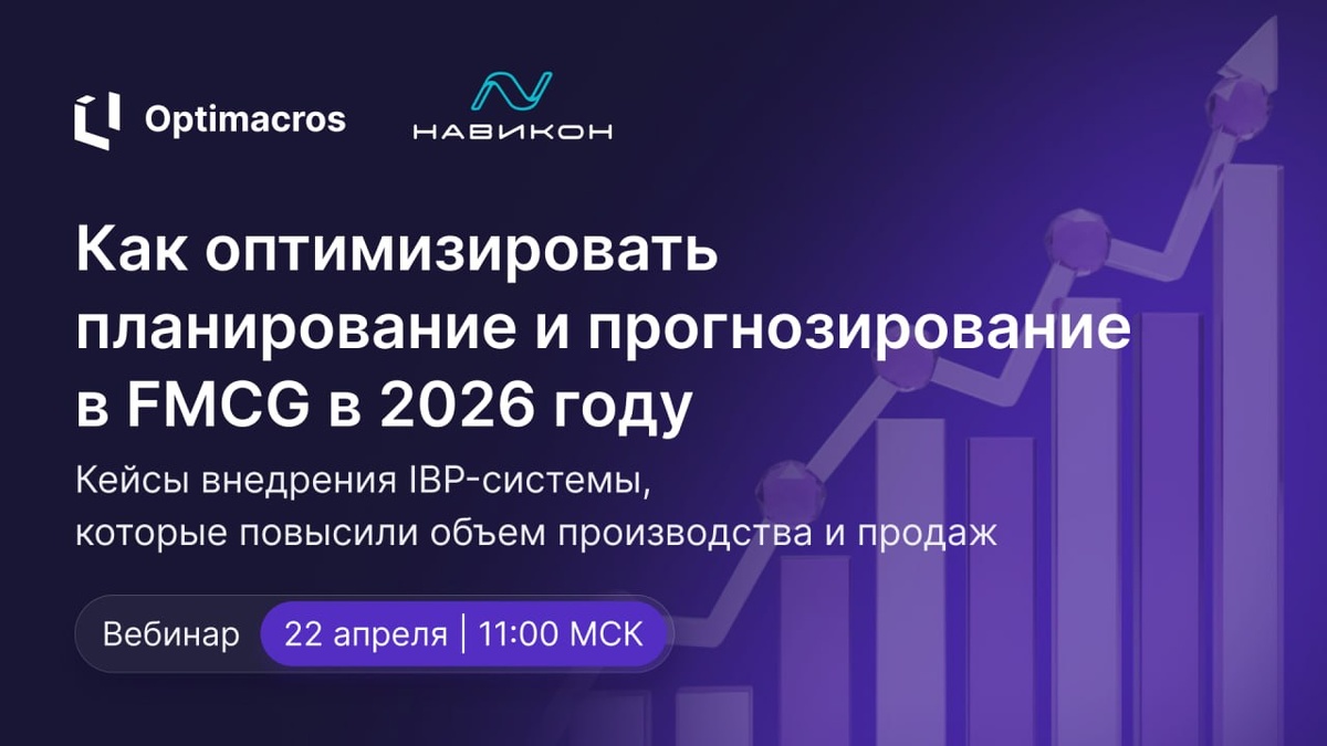 Хотите узнать, как с помощью IBP выстроить систему планирования, которая повысит прибыль бизнеса? Приглашаем на вебинар «Как оптимизировать планирование и прогнозирование в FMCG в 2026 году» от нашего партнера, компании «Навикон». Когда: 22 апреля в 11:00 мск В программе: ✅Главные вызовы планирования в FMCG в 2026 году. ✅Почему классический S&OP не обеспечивает нужную гибкость. ✅Как IBP помогает компаниям выстроить единую систему принятия решений на основе прогнозирования спроса. ✅Как синхронизировать стратегические цели, операционные планы и финансовые результаты в FMCG. Сергей Ступин, руководитель группы предпродажной подготовки «Оптимакрос», выступит с темой Графикование в FMCG: выдумка или реальность? Кому будет полезно: ИТ-директорам, руководителям ПЭО, специалистам по S&OP и производственному планированию. Бонусы для участников вебинара: 🔴бесплатный экспресс-аудит текущего процесса, 🔴скидка на внедрение IBP-системы в пилотном проекте. 👉Регистрируйтесь ___________________